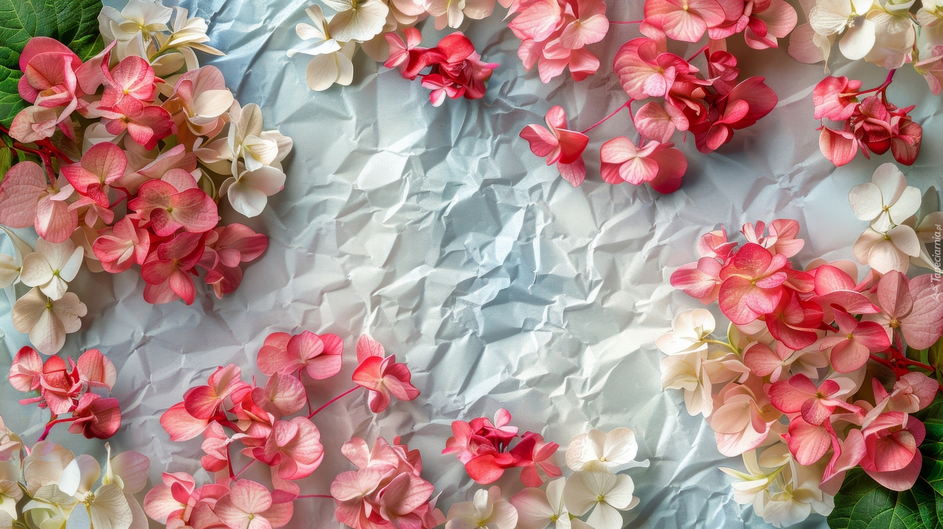 Edytor tapety: Różowe i białe płatki hortensji na kartce papieru