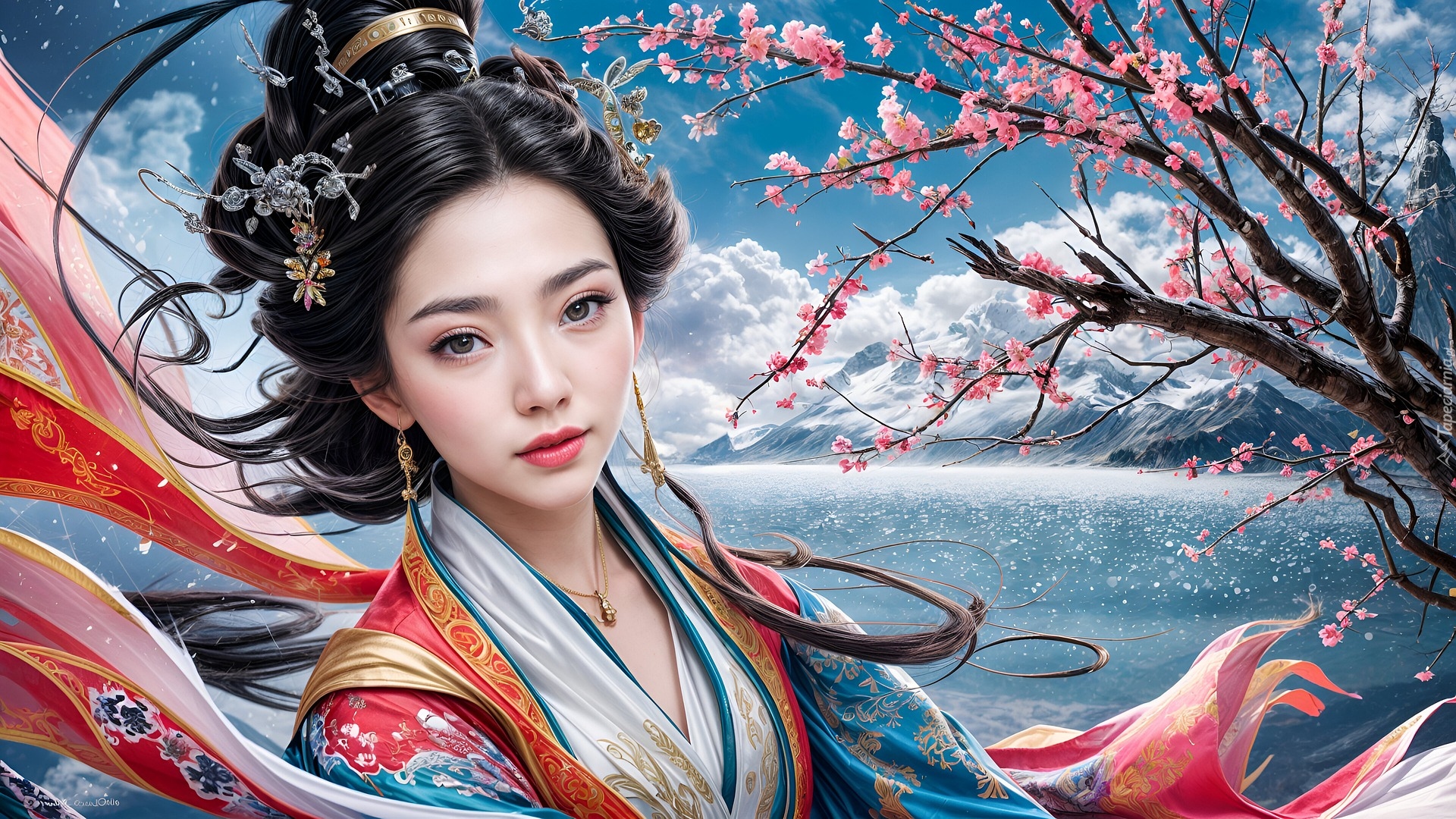 Edytor tapety: Azjatka w kimonie obok ukwieconych gałązek