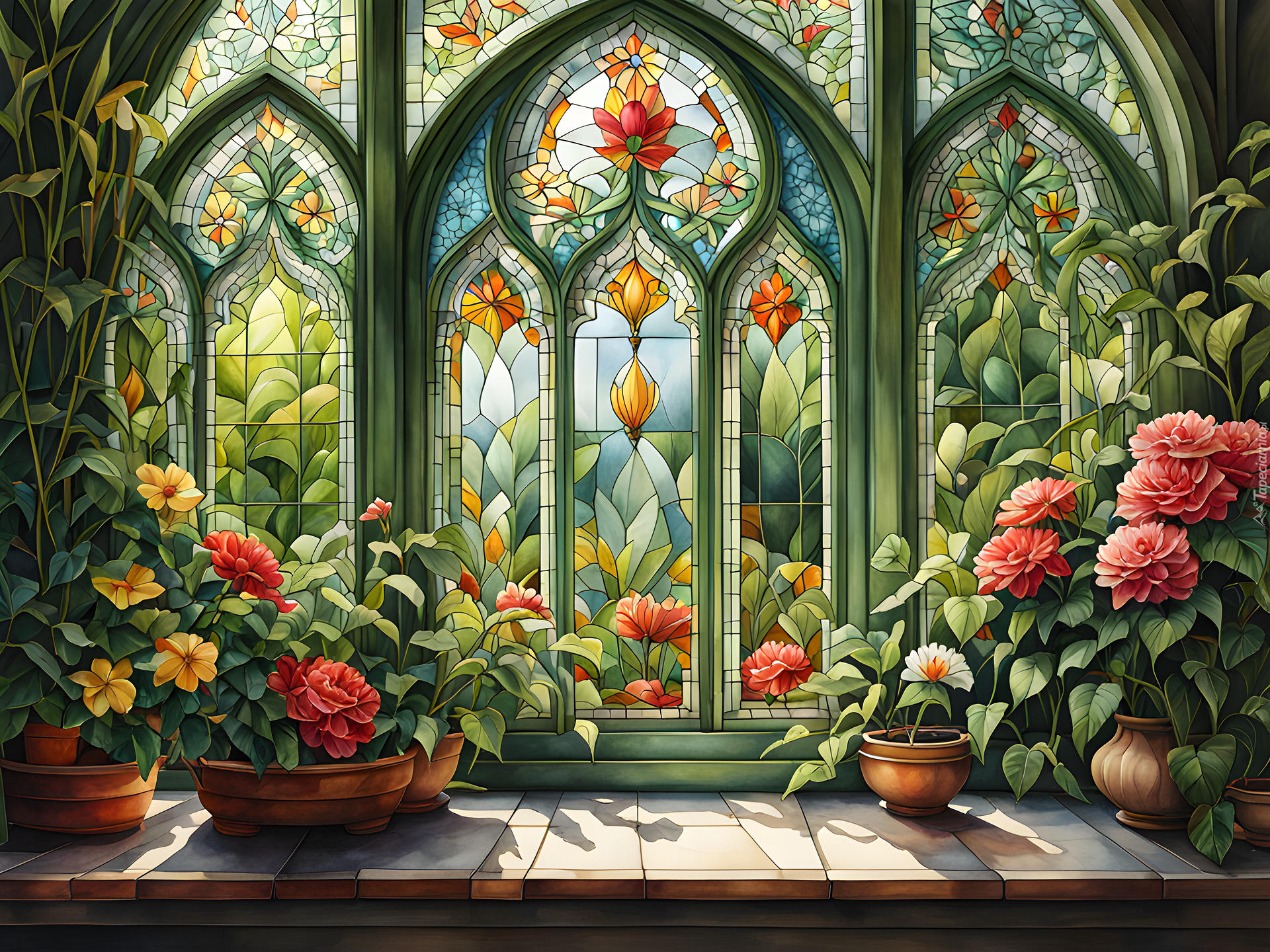Edytor tapety: Kwiaty w doniczkach na parapecie okna z witrażami