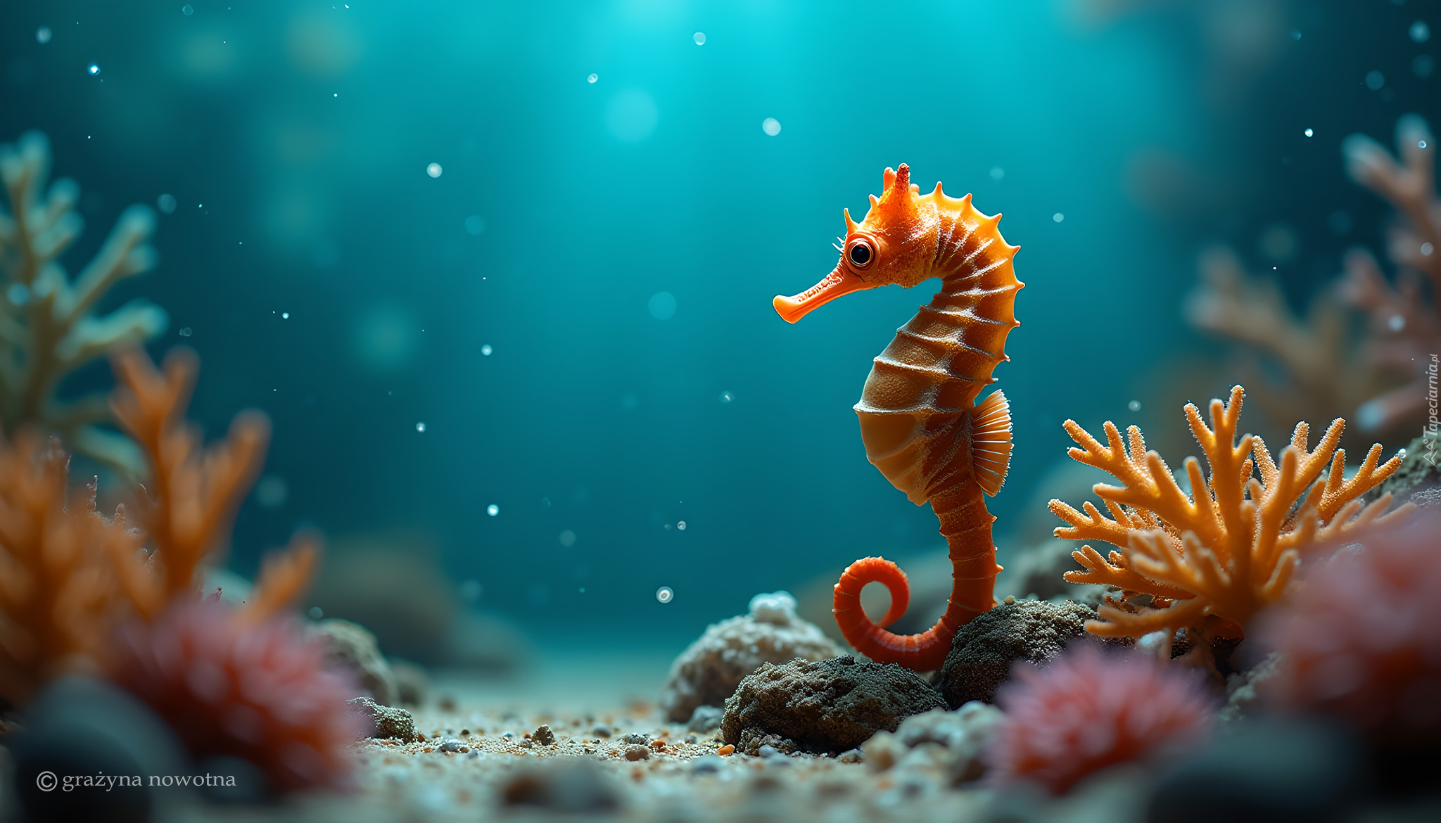 Edytor tapety: Konik morski i koralowce w morzu