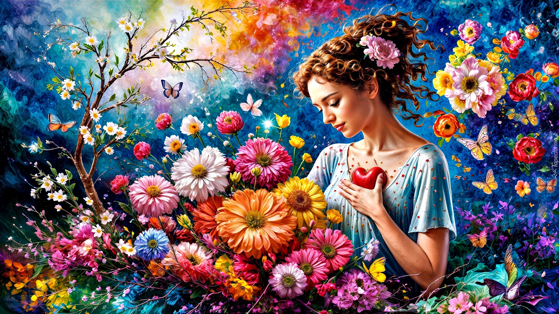 Edytor tapety: Kobieta z sercem w ręce wśród kolorowych kwiatów