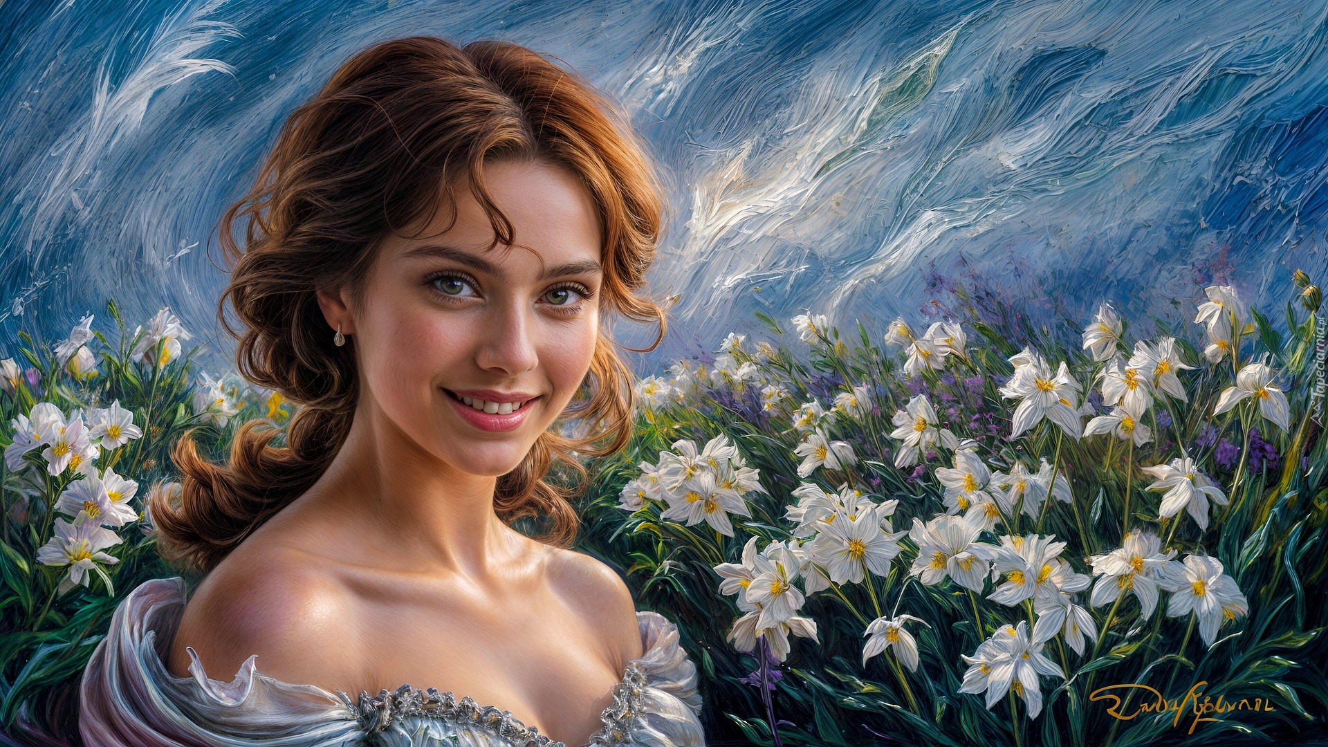Edytor tapety: Uśmiechnięta kobieta wśród białych kwiatów w malarstwie