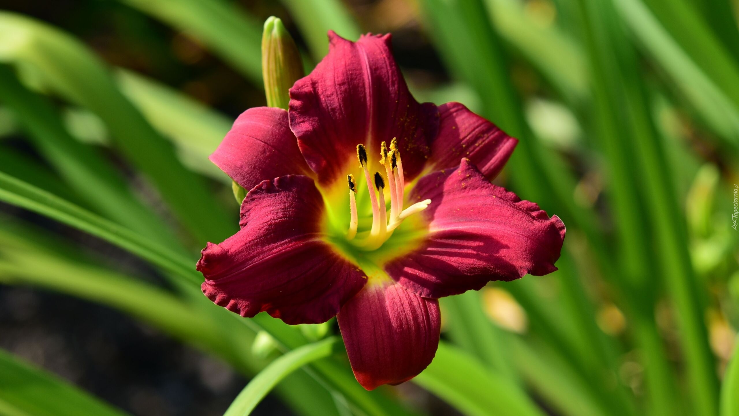 Edytor tapety: Rozwinięty rozświetlony czerwony liliowiec na tle rozmytych liści