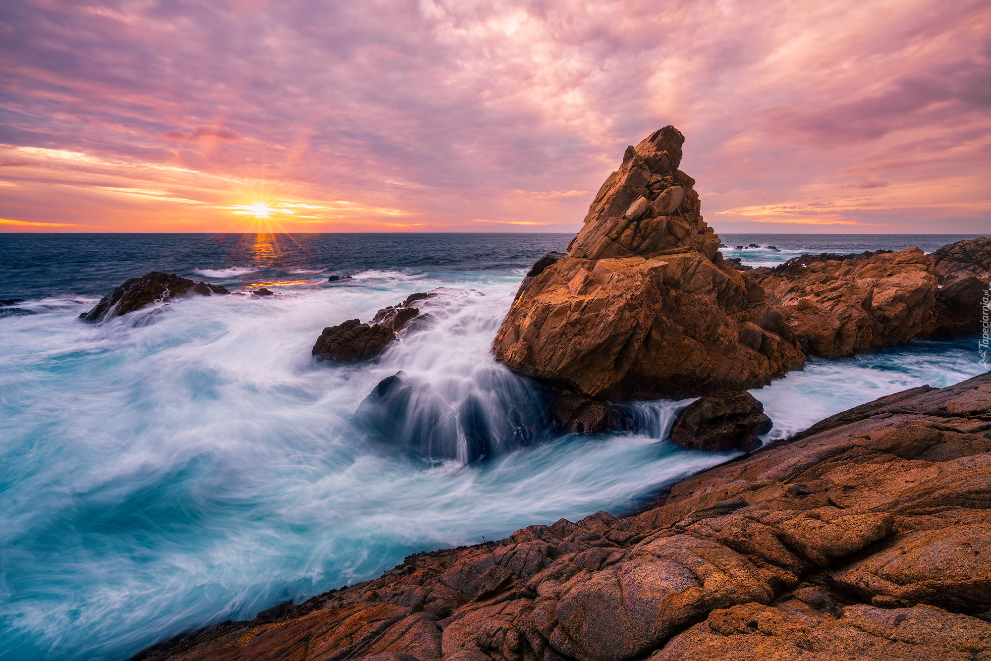 Edytor tapety: Skały w morzu pod zaróżowionym niebem zachodzącego słońca