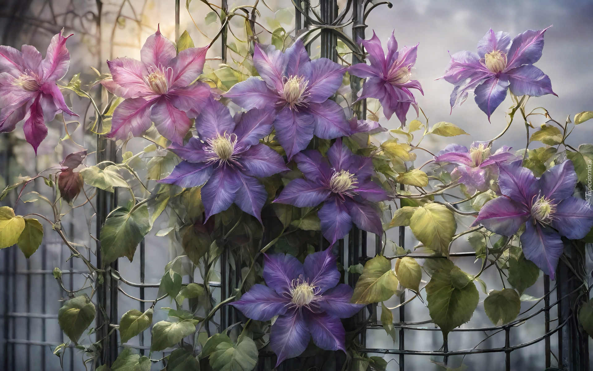 Edytor tapety: Fioletowe kwiaty powojnika oplatające ogrodzenie