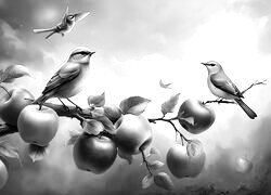 Edytor tapety: Kolorowe ptaki i jabłka na gałęzi drzewa