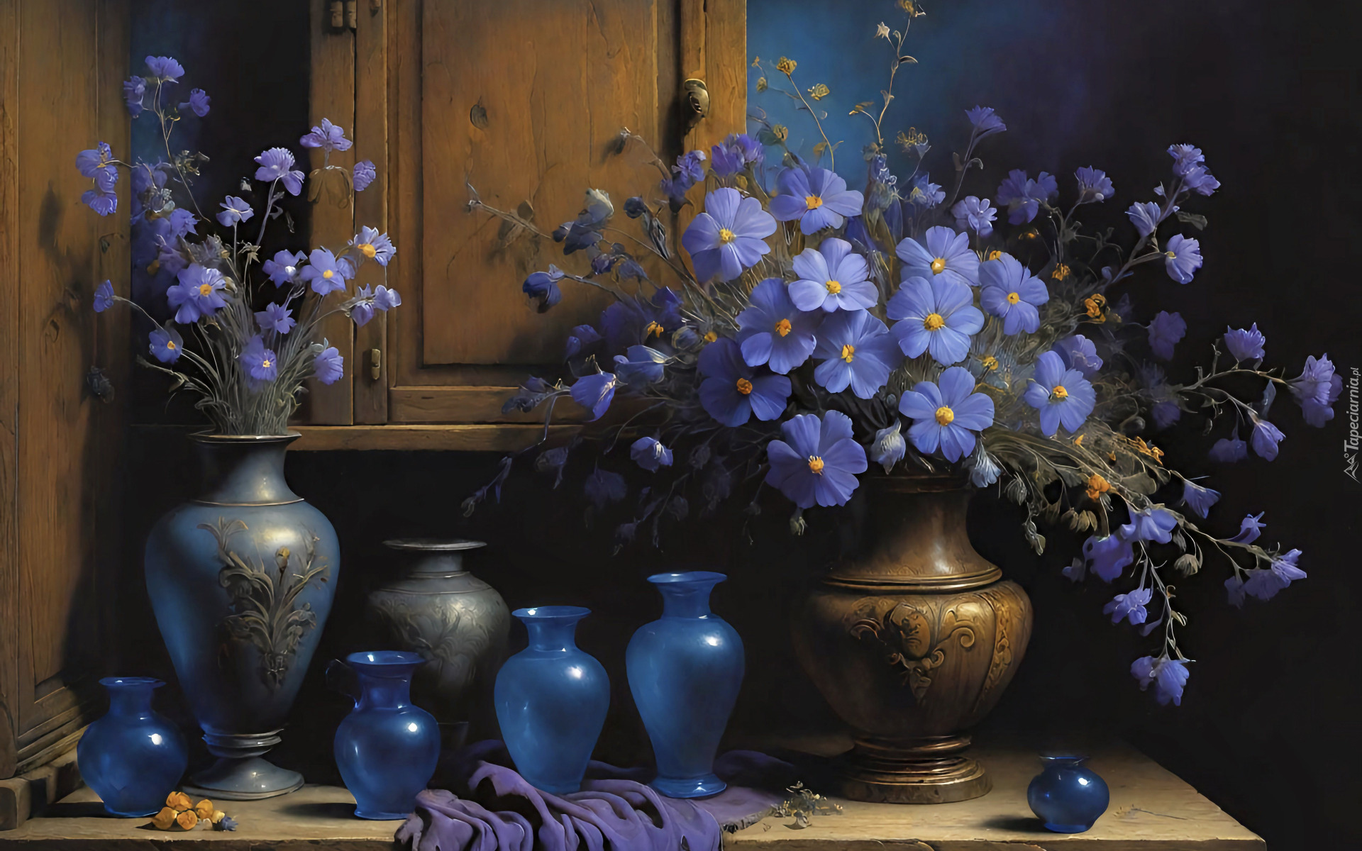 Edytor tapety: Niebieskie kwiaty w wazonach na stole przy szafce