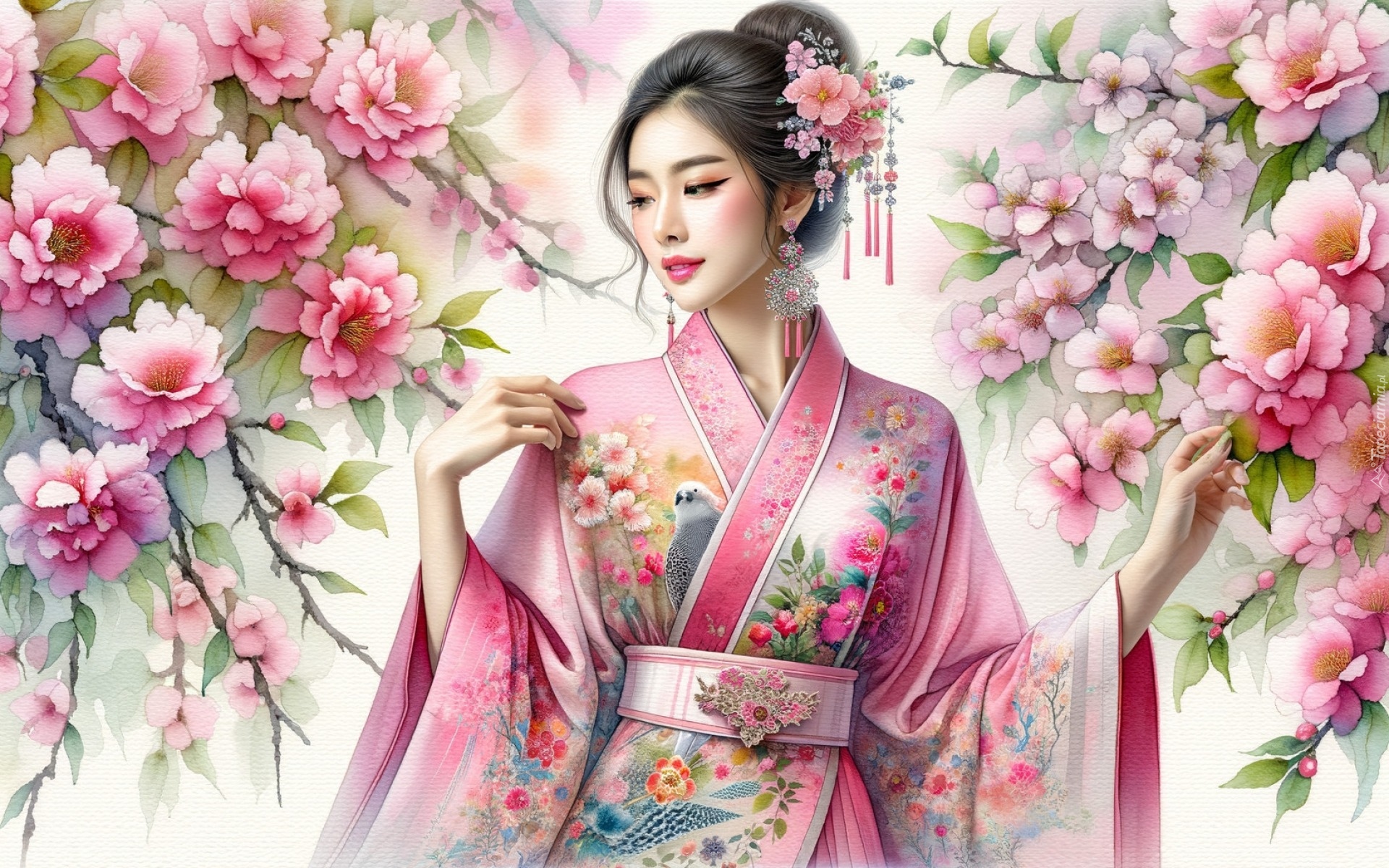 Edytor tapety: Gejsza w kolorowym kimonie wśród ukwieconych gałązek