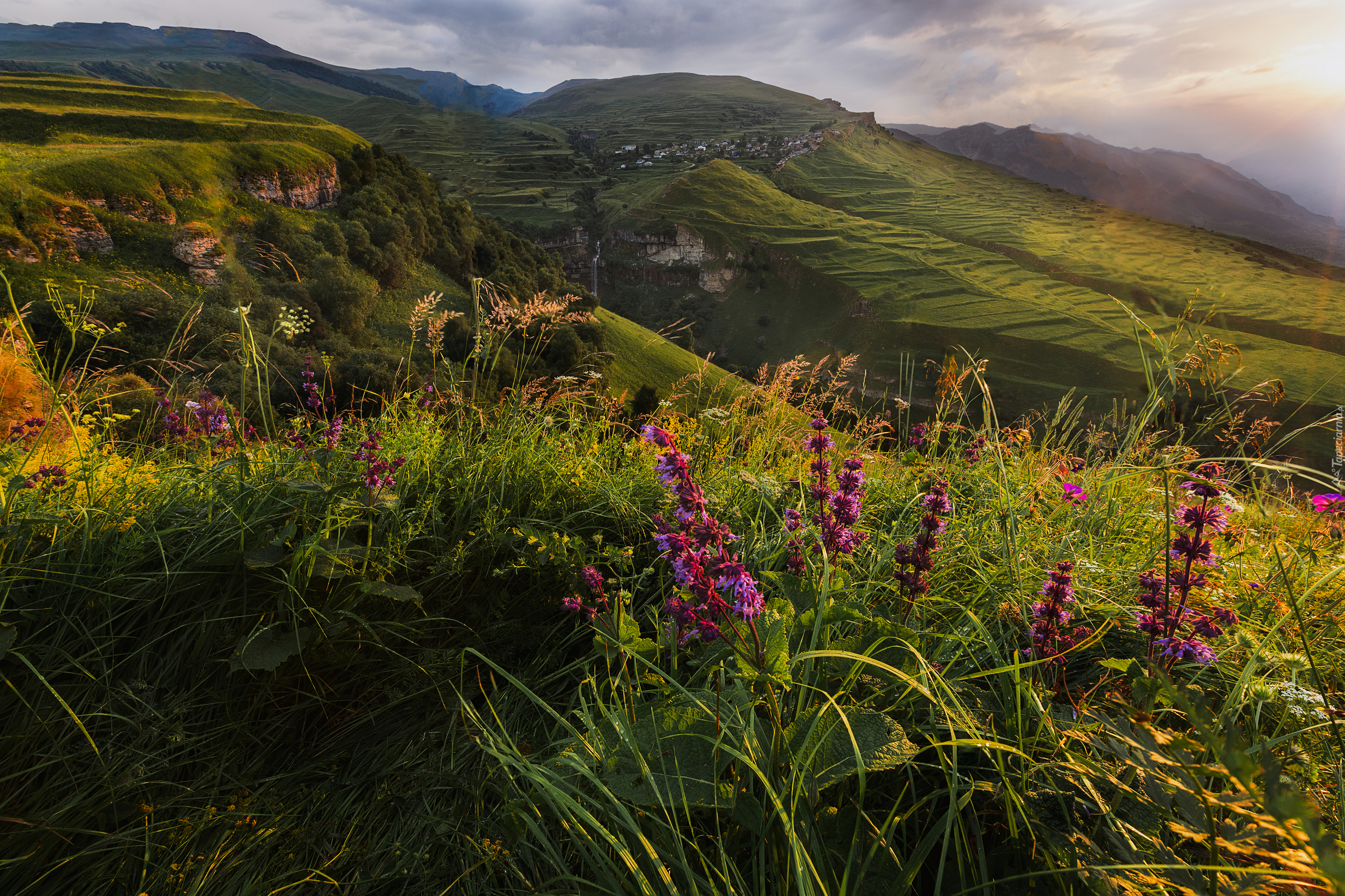Edytor tapety: Rozświetlone kwiaty na łące w górach Kaukazu