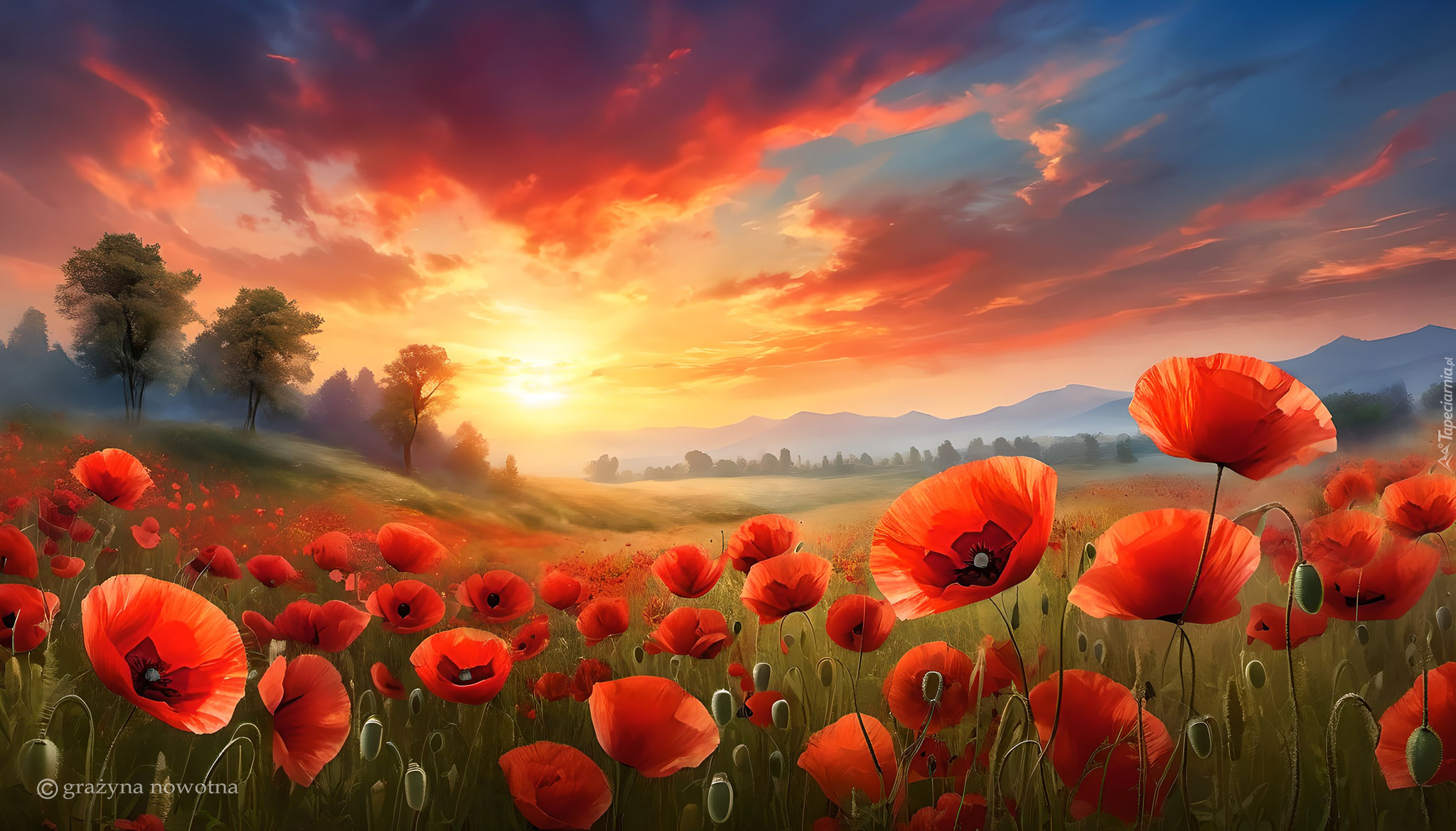 Edytor tapety: Czerwone maki na łące w blasku wschodzącego słońca