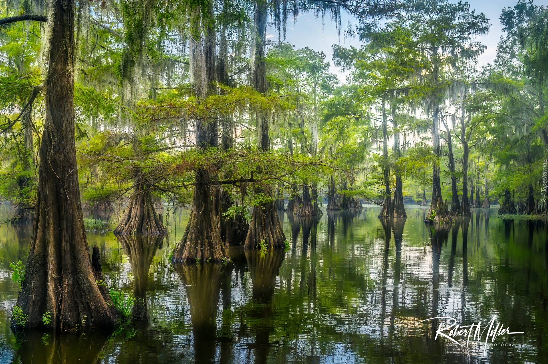 Edytor tapety: Cyprysy bagienne w jeziorze Caddo Lake w Teksasie