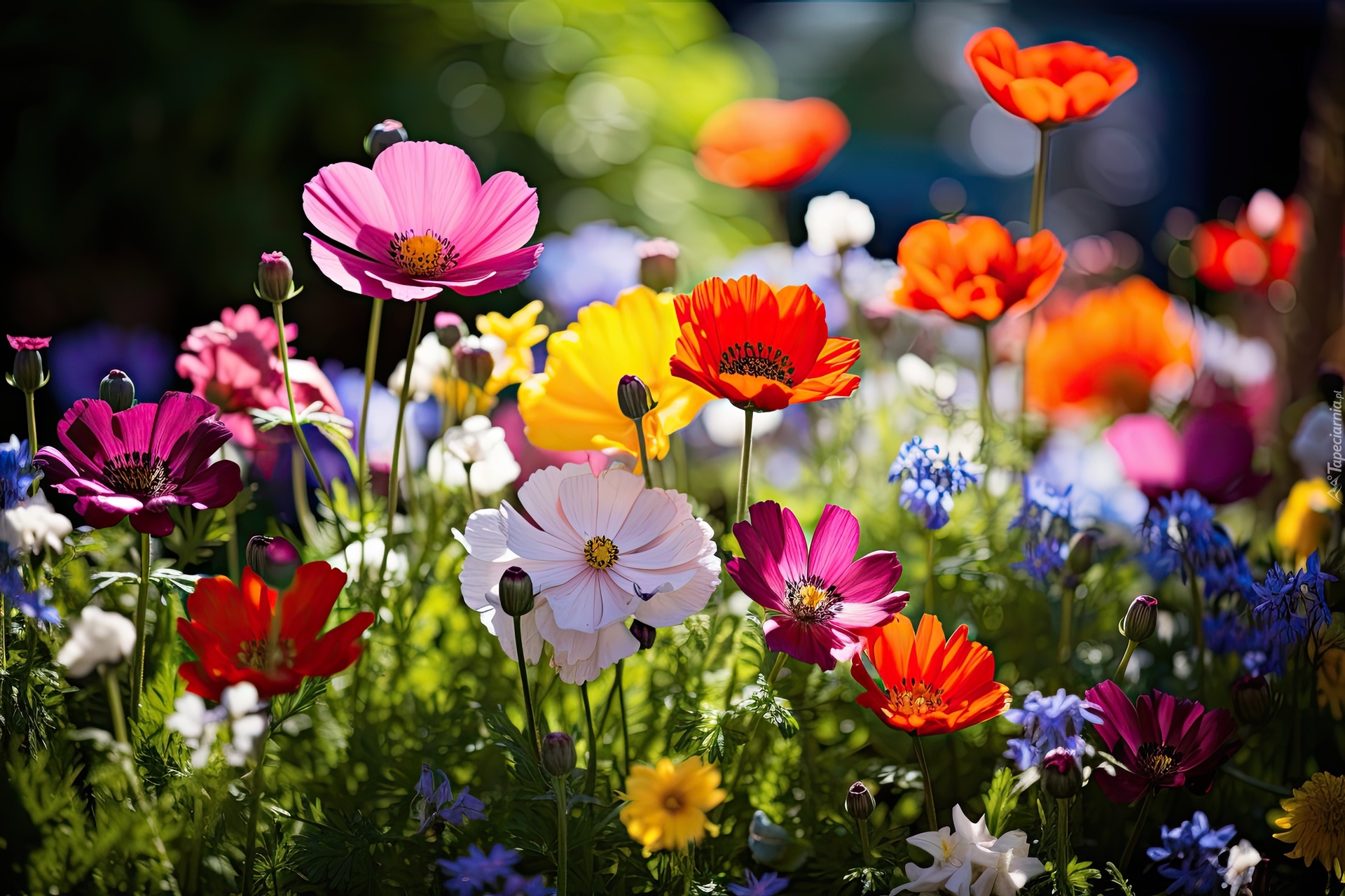 Edytor tapety: Rozświetlone światłem kolorowe kwiaty w ogrodzie