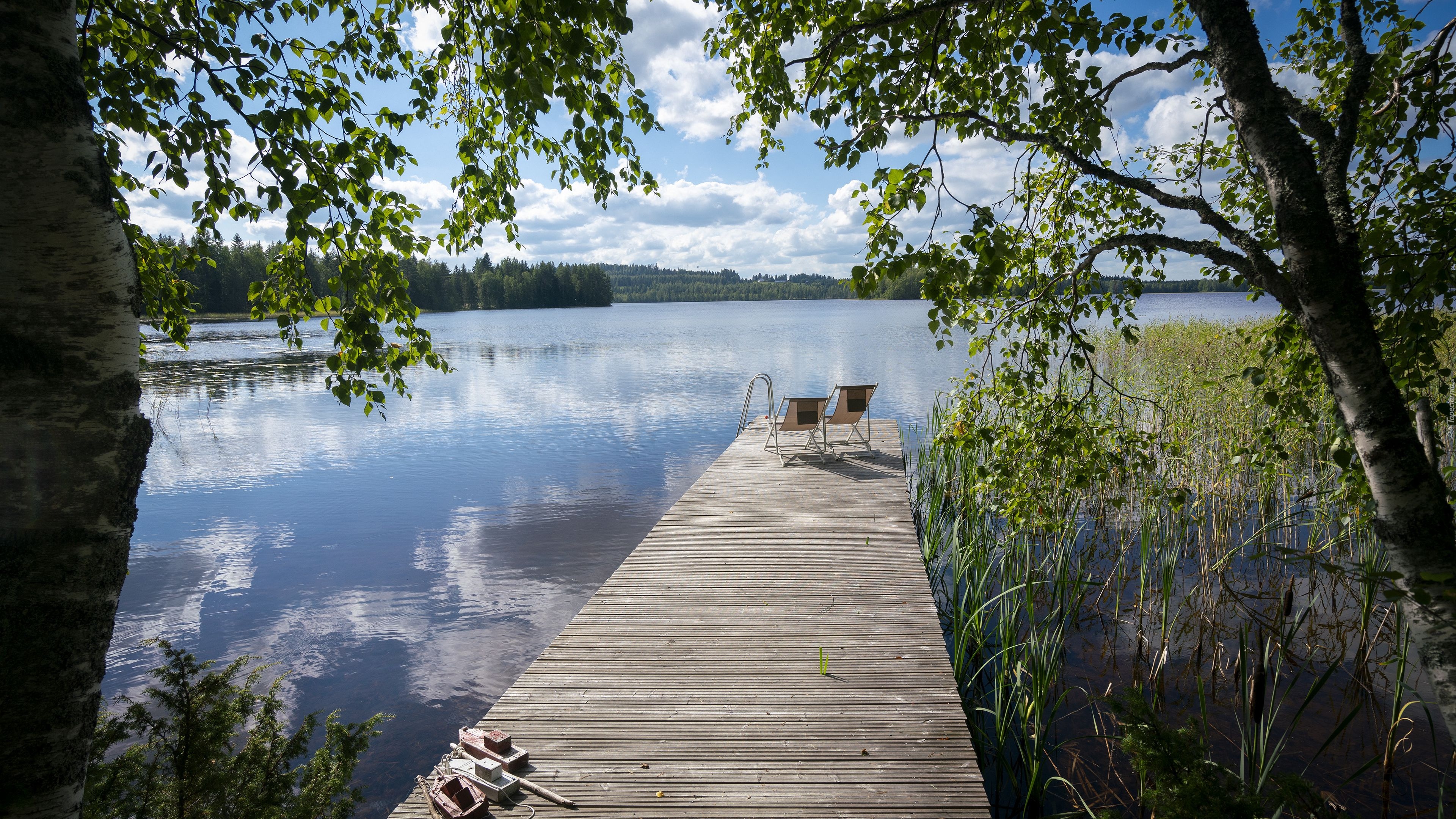 Edytor tapety: Leżaki na pomoście z widokiem na jezioro