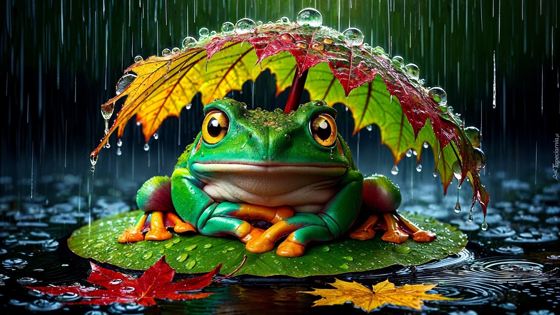 Edytor tapety: Grafika z żabą pod liściem w deszczu