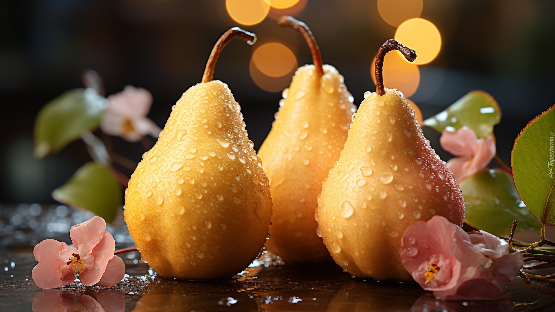 Edytor tapety: Krople wody na trzech gruszkach i kwiatach