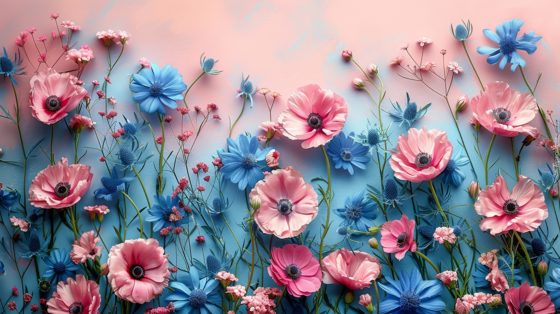 Edytor tapety: Różowe i niebieskie kwiaty na kolorowym tle