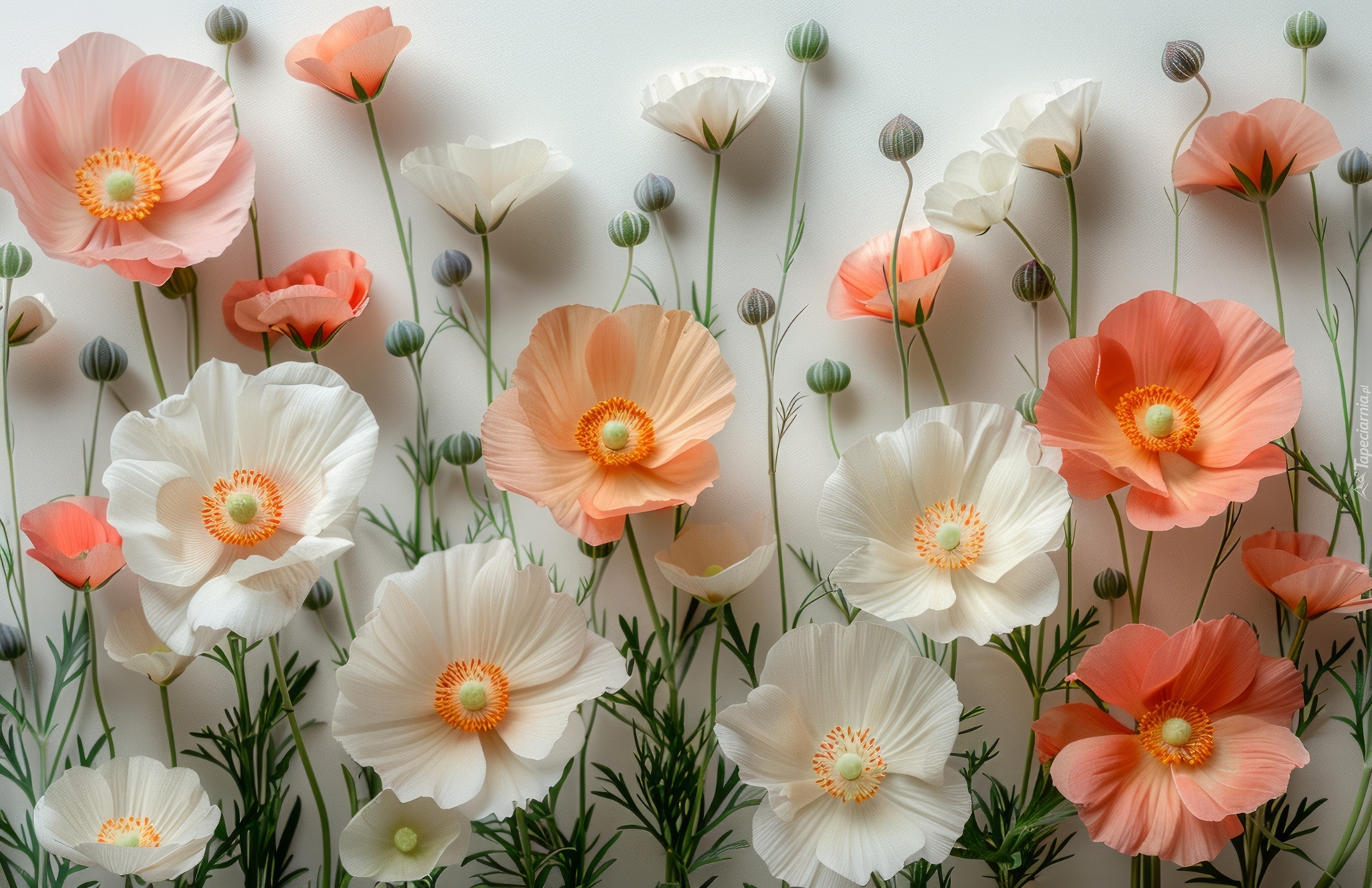 Edytor tapety: Białe i pomarańczowe kwiaty na jasnym tle