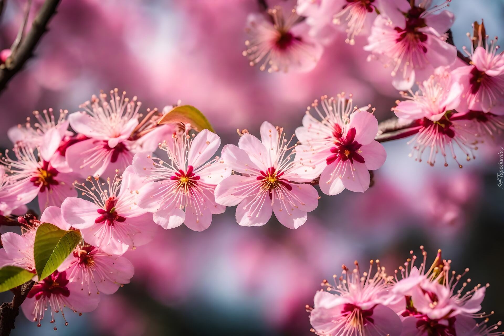 Edytor tapety: Różowe kwiaty na gałązkach drzewa owocowego w zbliżeniu