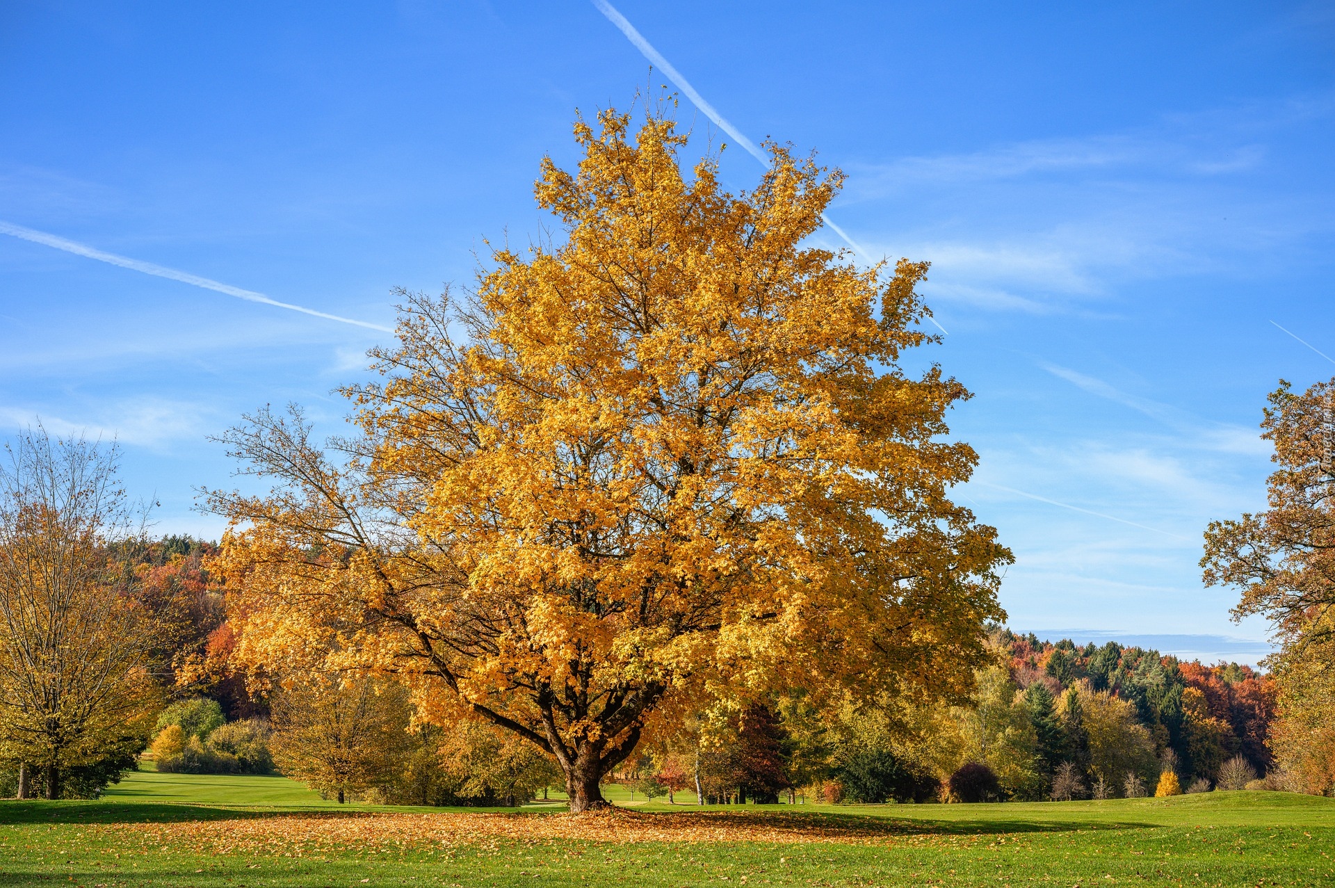 Edytor tapety: Pożółkły klon na łące pod niebieskim niebem