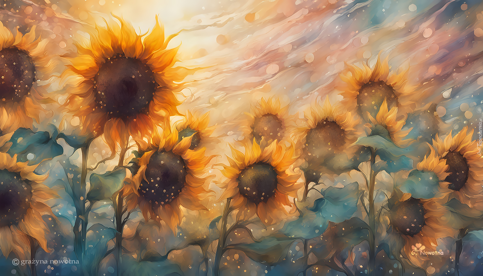 Edytor tapety: Żółte słoneczniki w blasku światła na rozmytym tle