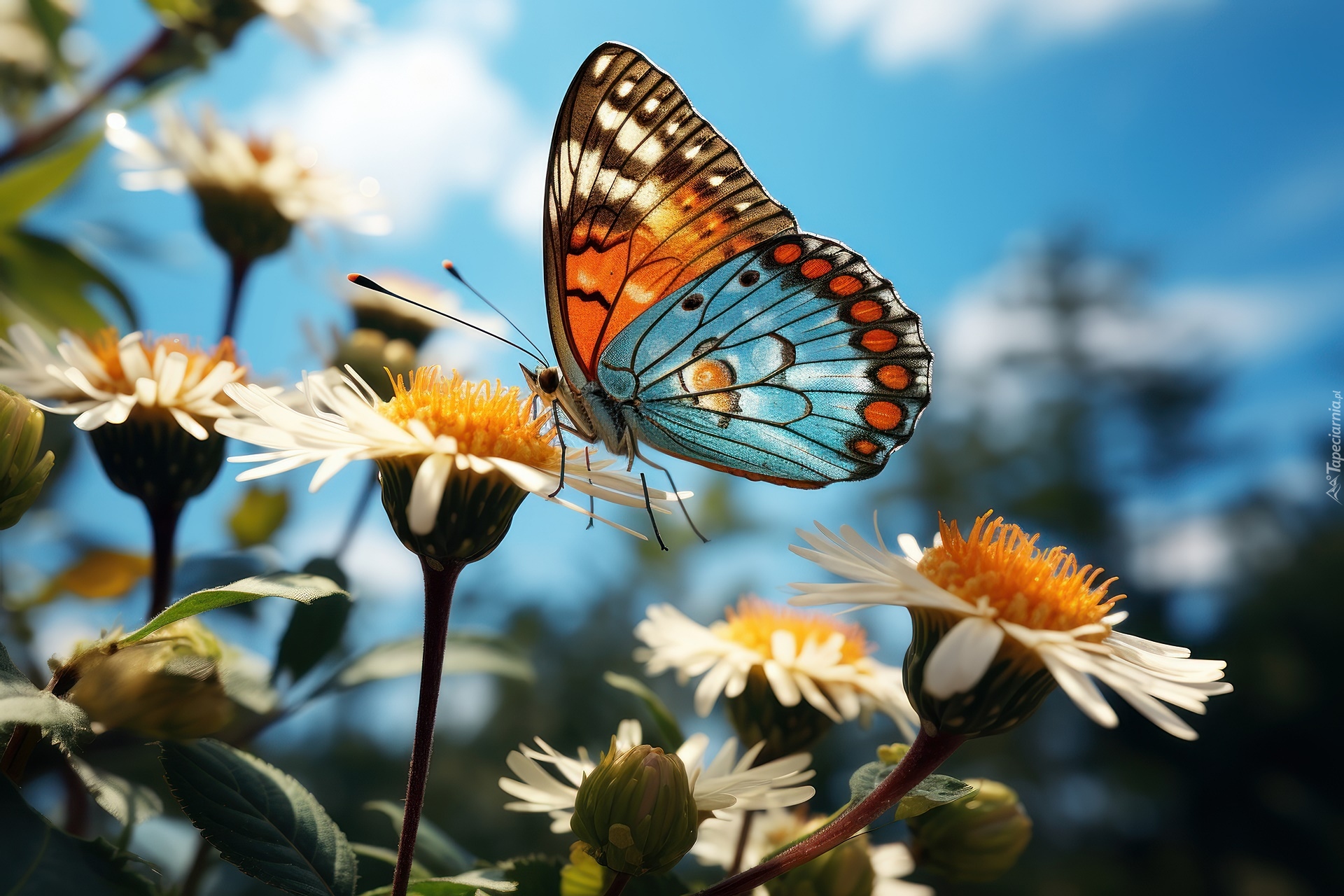 Edytor tapety: Kolorowy motyl na białych kwiatach na tle nieba
