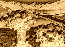 Edytor tapety: Jesienne kwiaty w wazonach na tle jeziora i gór