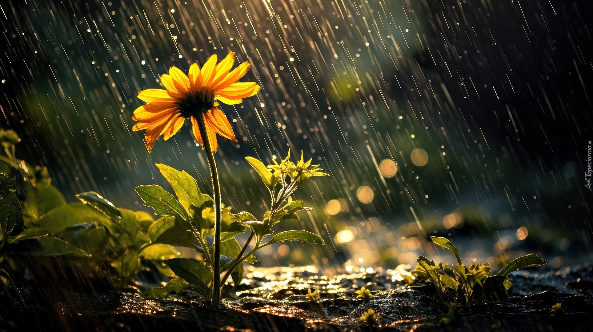Edytor tapety: Rozświetlony żółty kwiat w padającym deszczu