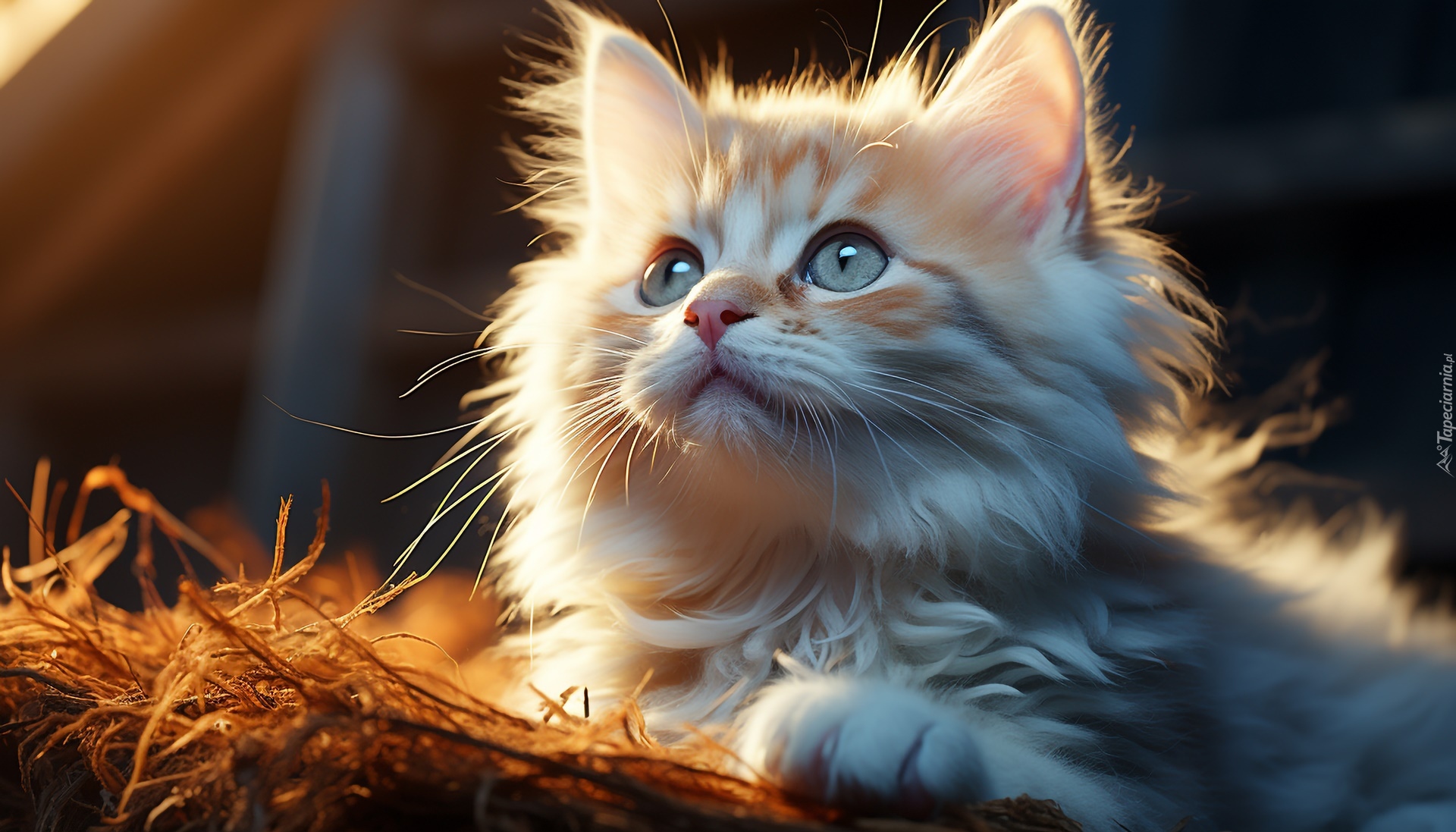 Edytor tapety: Biały puszysty kotek patrzący w górę