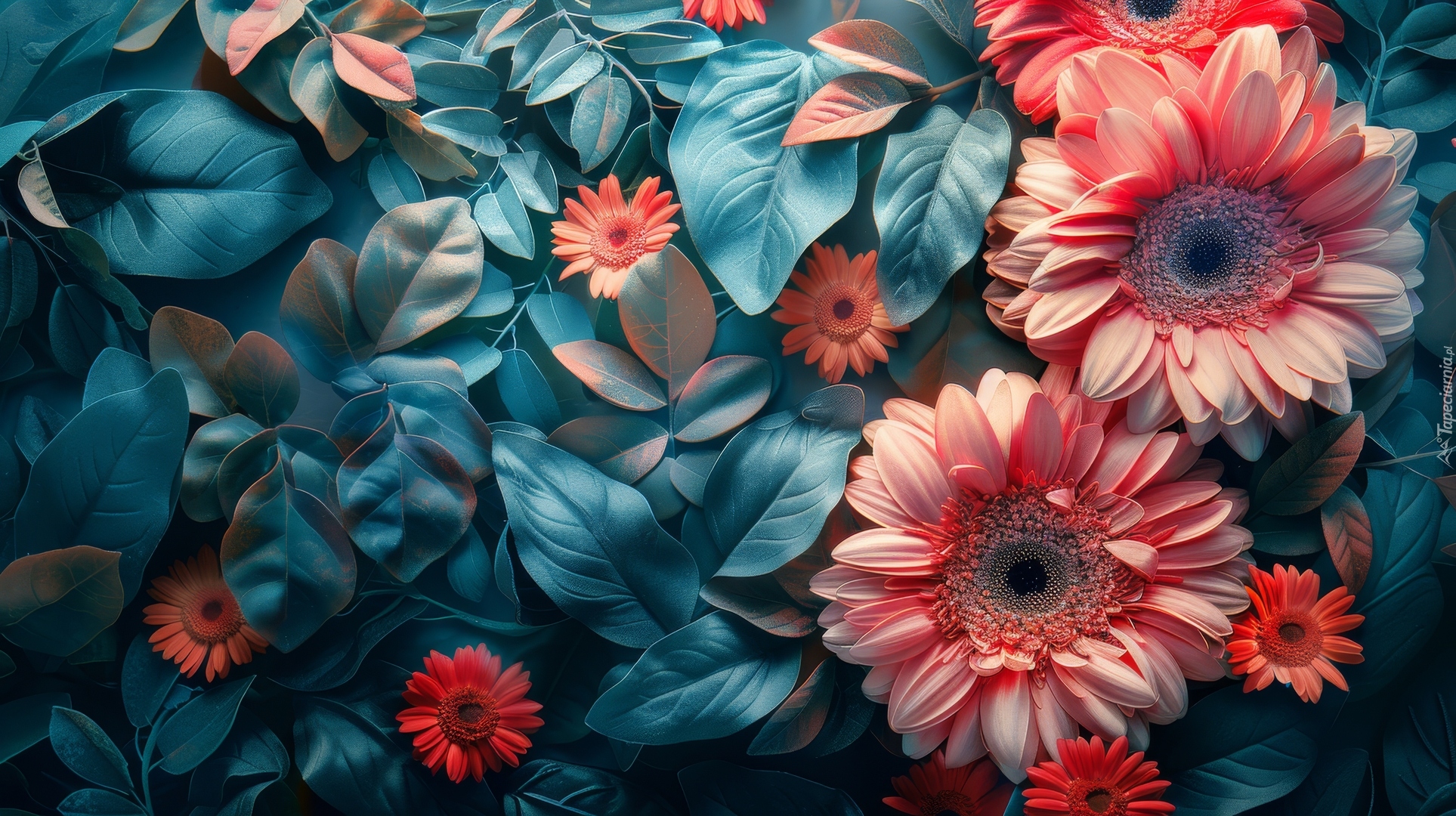Edytor tapety: Duże i małe gerbery wśród liści