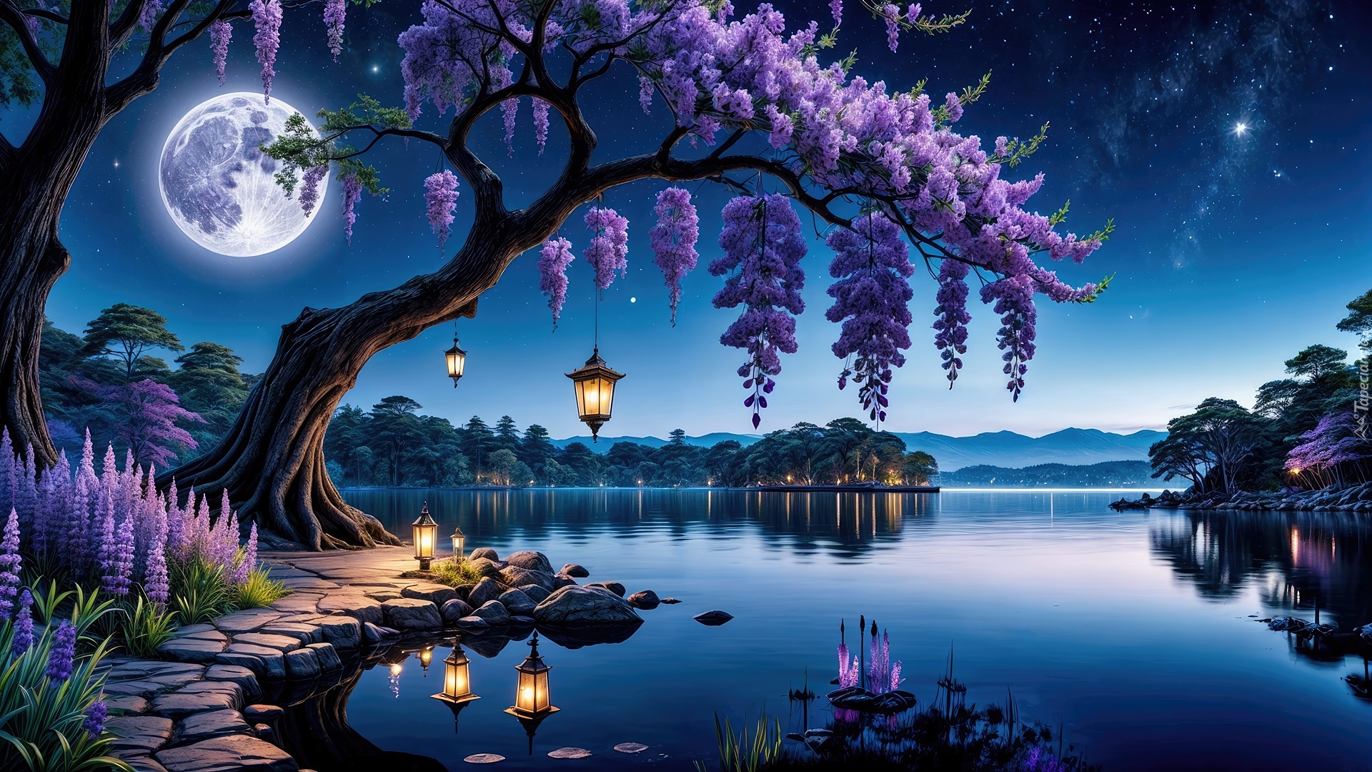 Edytor tapety: Drzewo i lampiony nad jeziorem w blasku księżyca