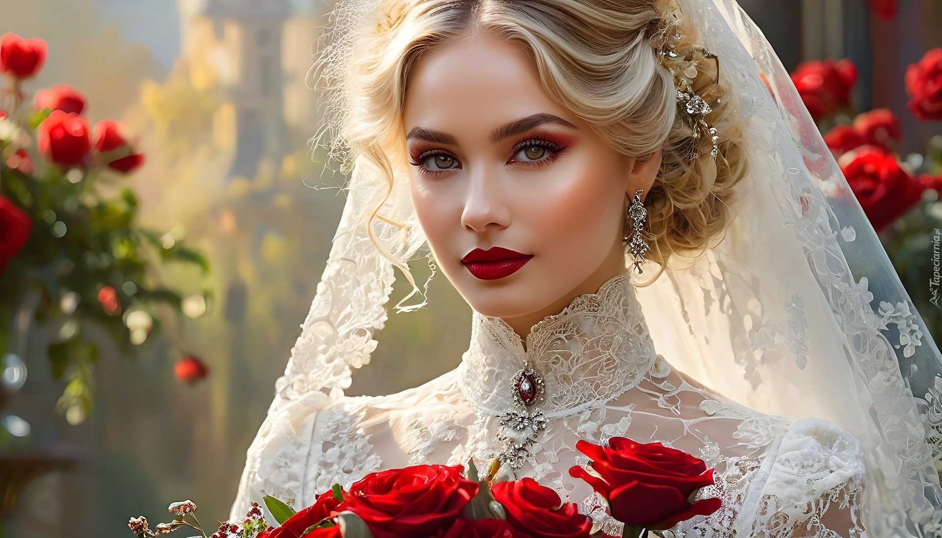 Edytor tapety: Panna młoda w welonie z bukietem czerwonych róż