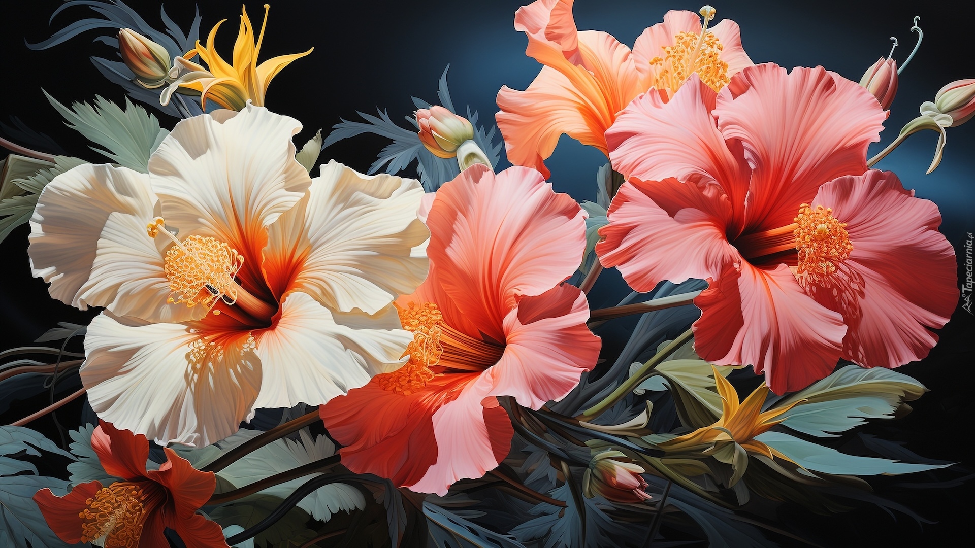 Edytor tapety: Rozświetlone kolorowe hibiskusy w grafice