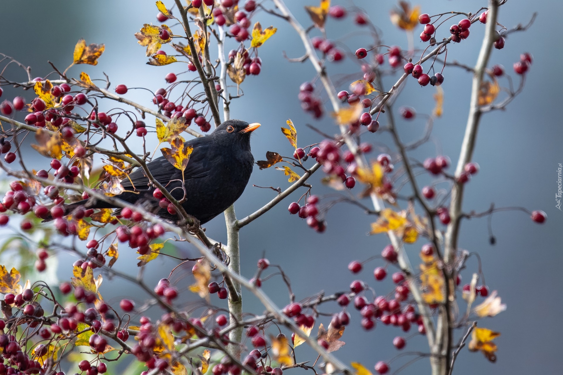 Edytor tapety: Kos siedzący na gałązce krzewu z owocami