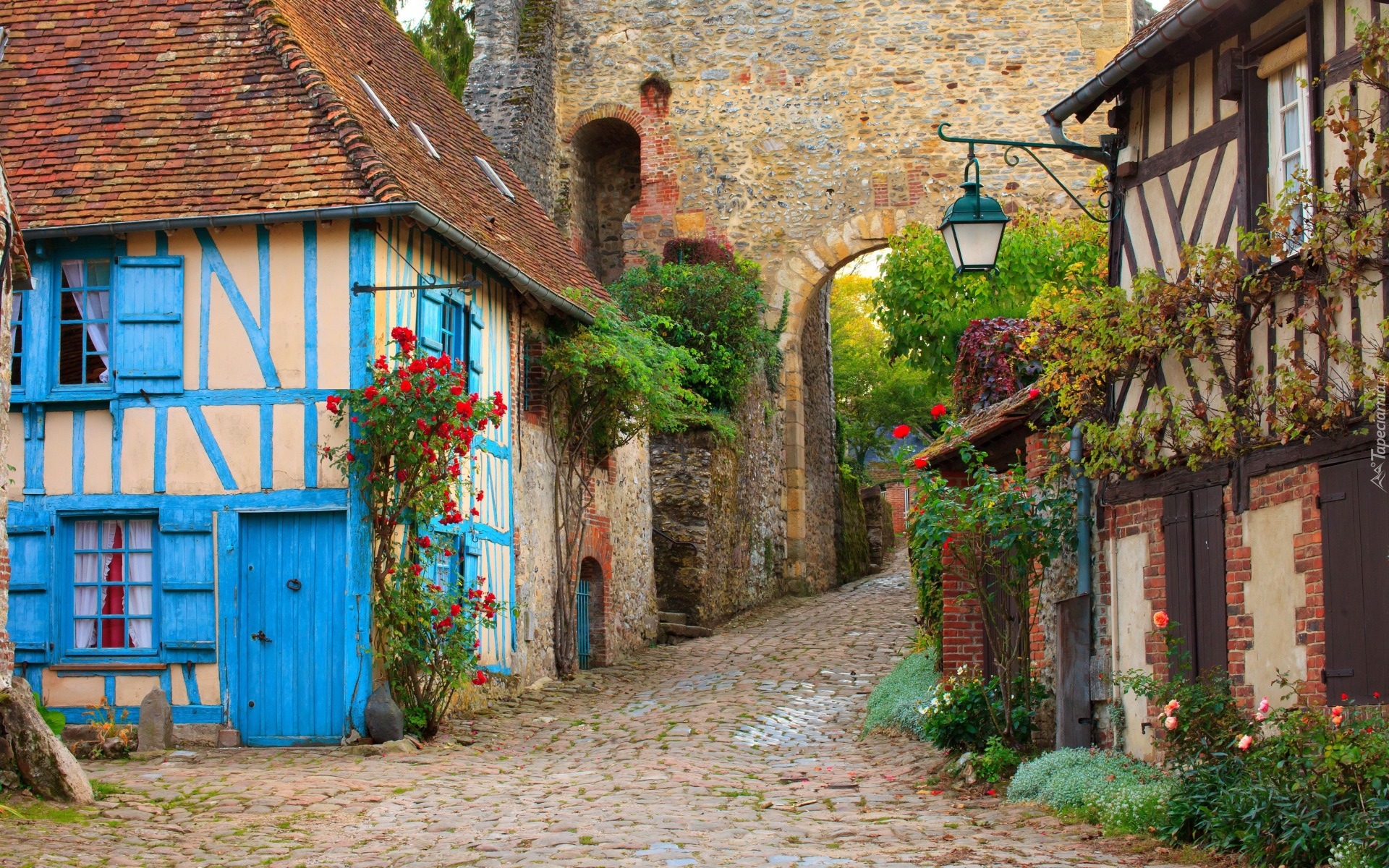 Edytor tapety: Domy przy brukowanej uliczce w Gerberoy we Francji