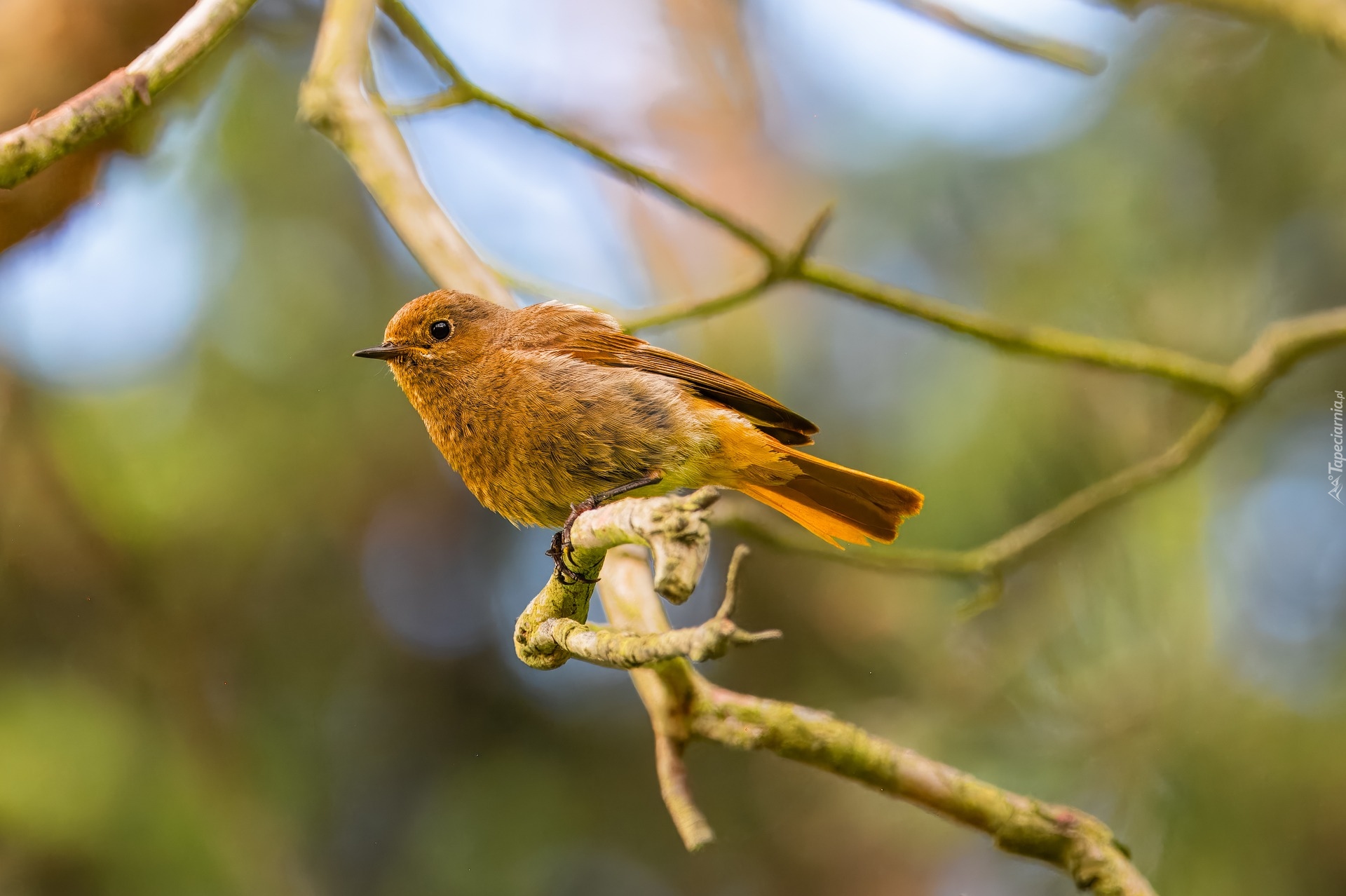 Edytor tapety: Rozmyte tło i ptak na suchej gałęzi