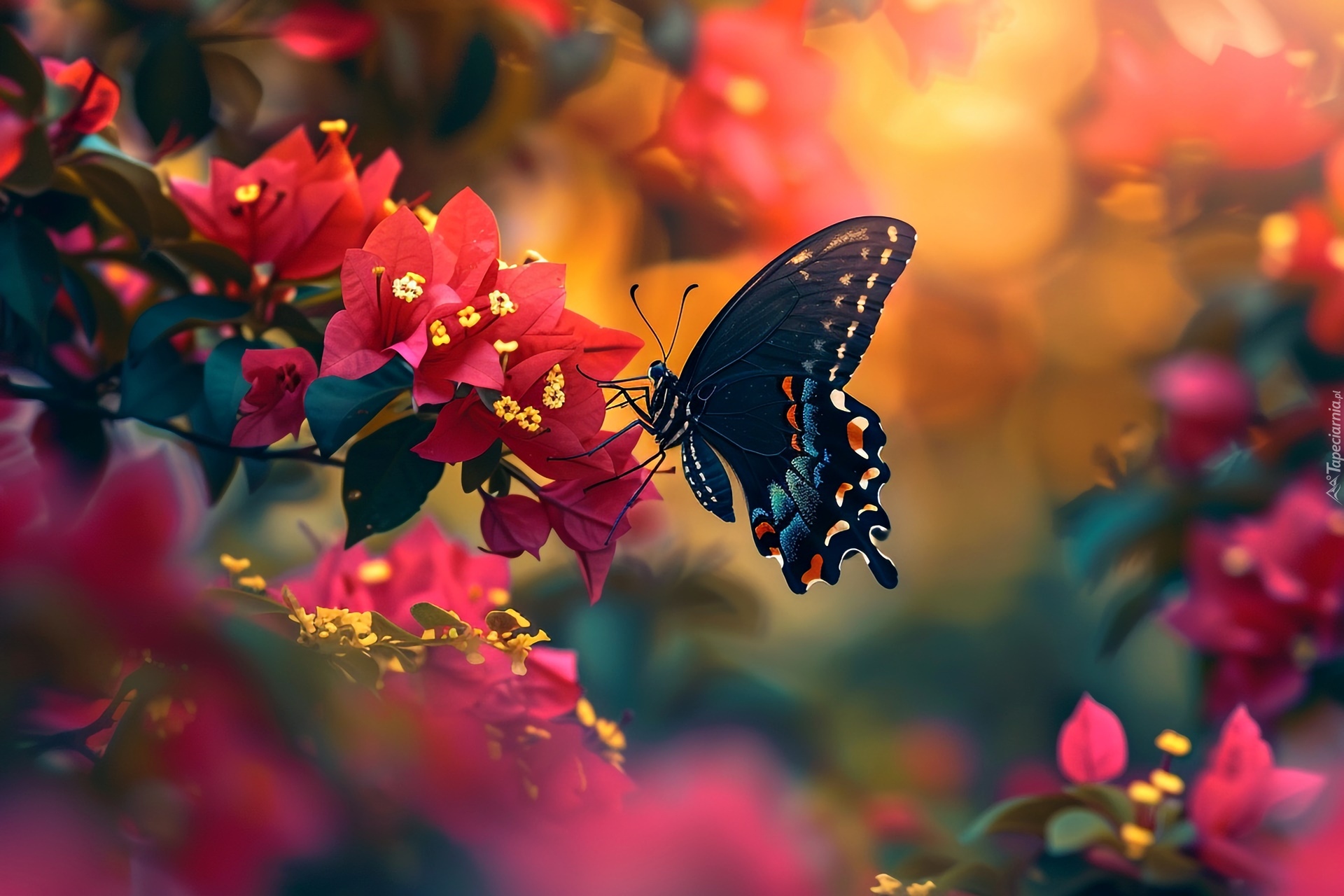 Edytor tapety: Motyl na czerwonych kwiatach bugenwilli