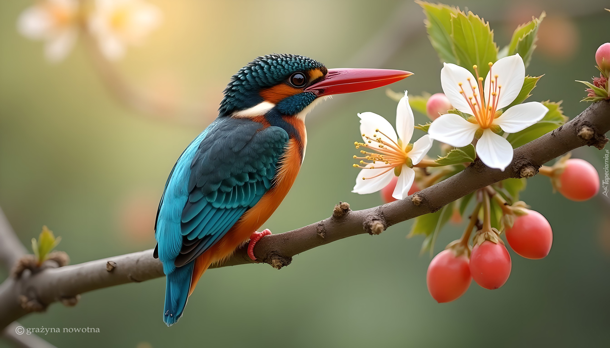 Edytor tapety: Zimorodek na gałęzi z kwiatami i owocami