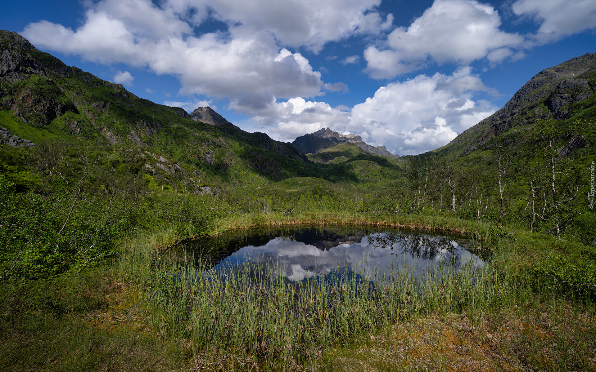 Edytor tapety: Obłoki nad małym stawem w górach