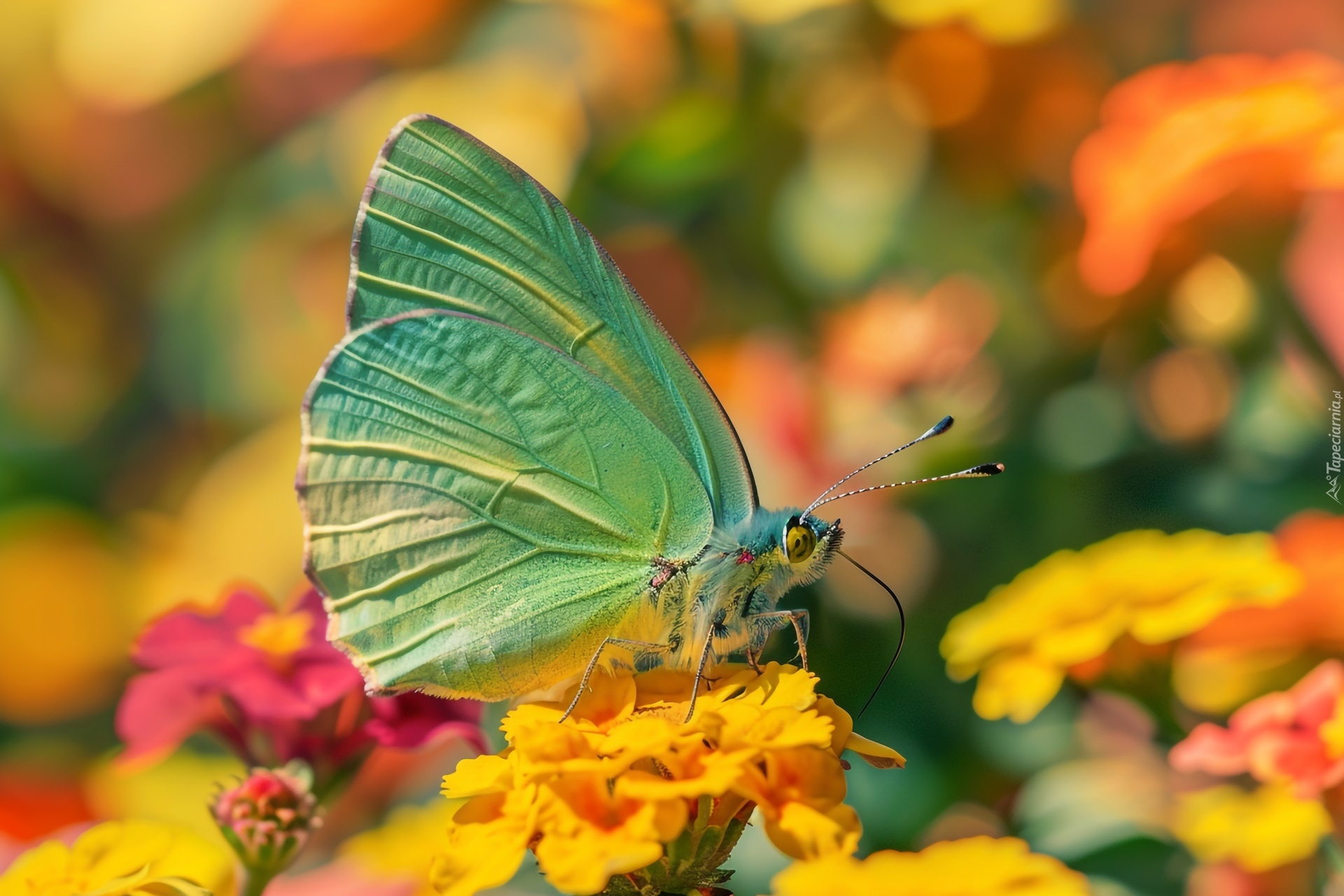Edytor tapety: Rozmyte tło i zielony motyl na żółtych kwiatach