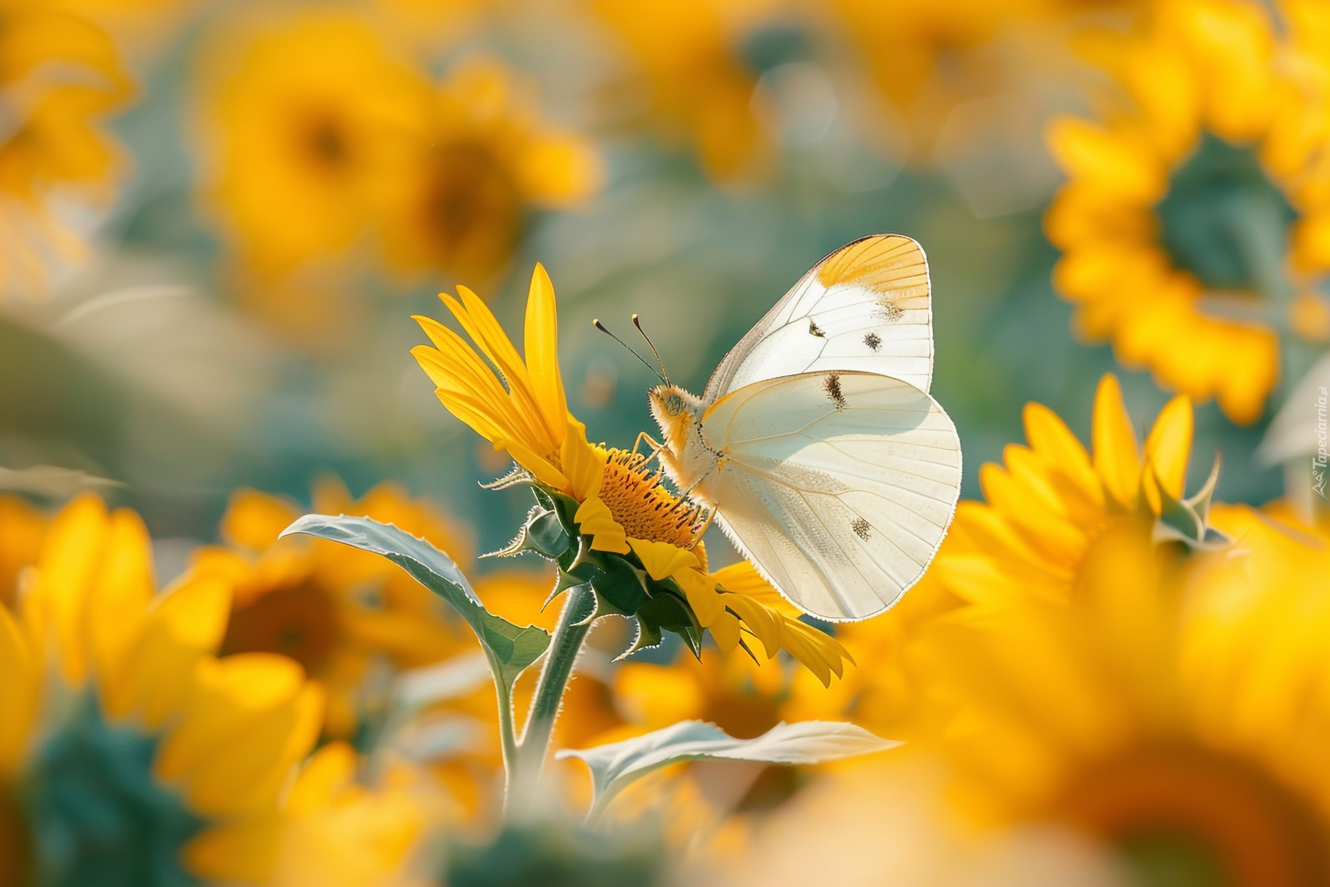 Edytor tapety: Biały motyl na żółtym kwiatku słonecznika