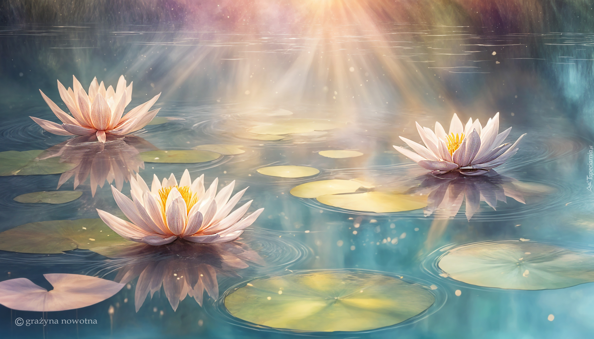 Edytor tapety: Trzy rozświetlone promieniami słońca lilie wodne w grafice