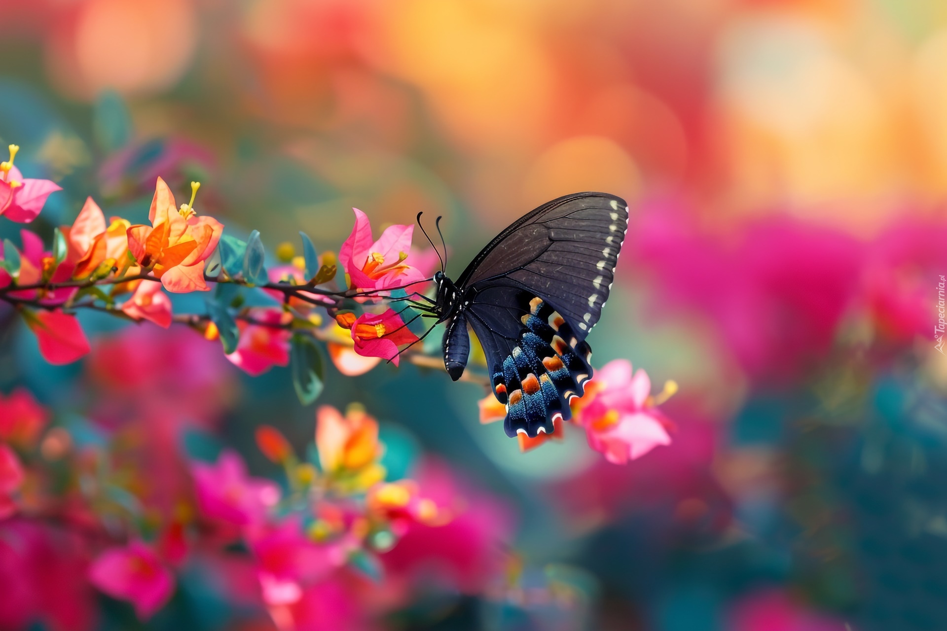 Edytor tapety: Motyl na kwiatach bugenwilli w grafice