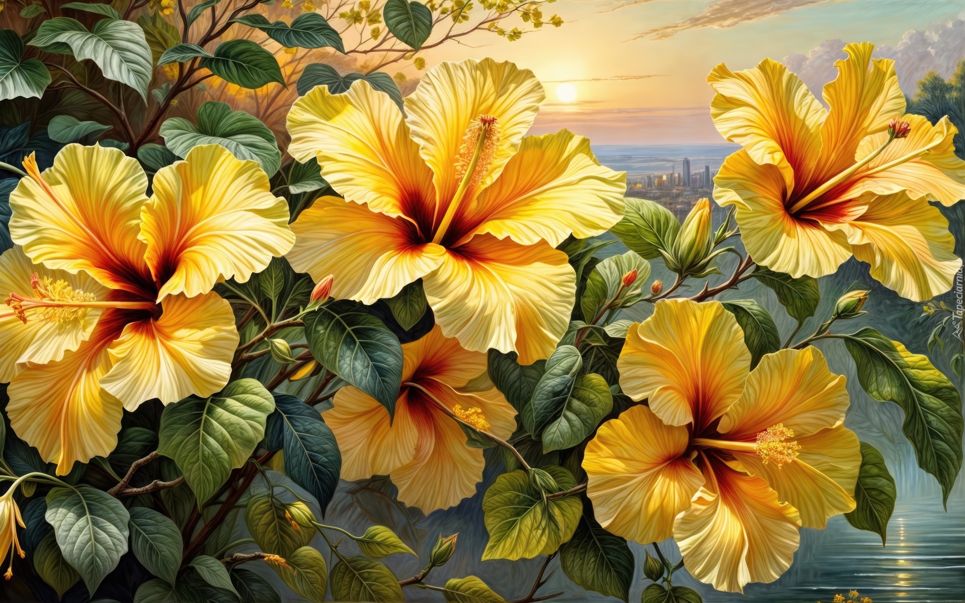 Edytor tapety: Grafika z żółtymi kwiatami hibiskusa