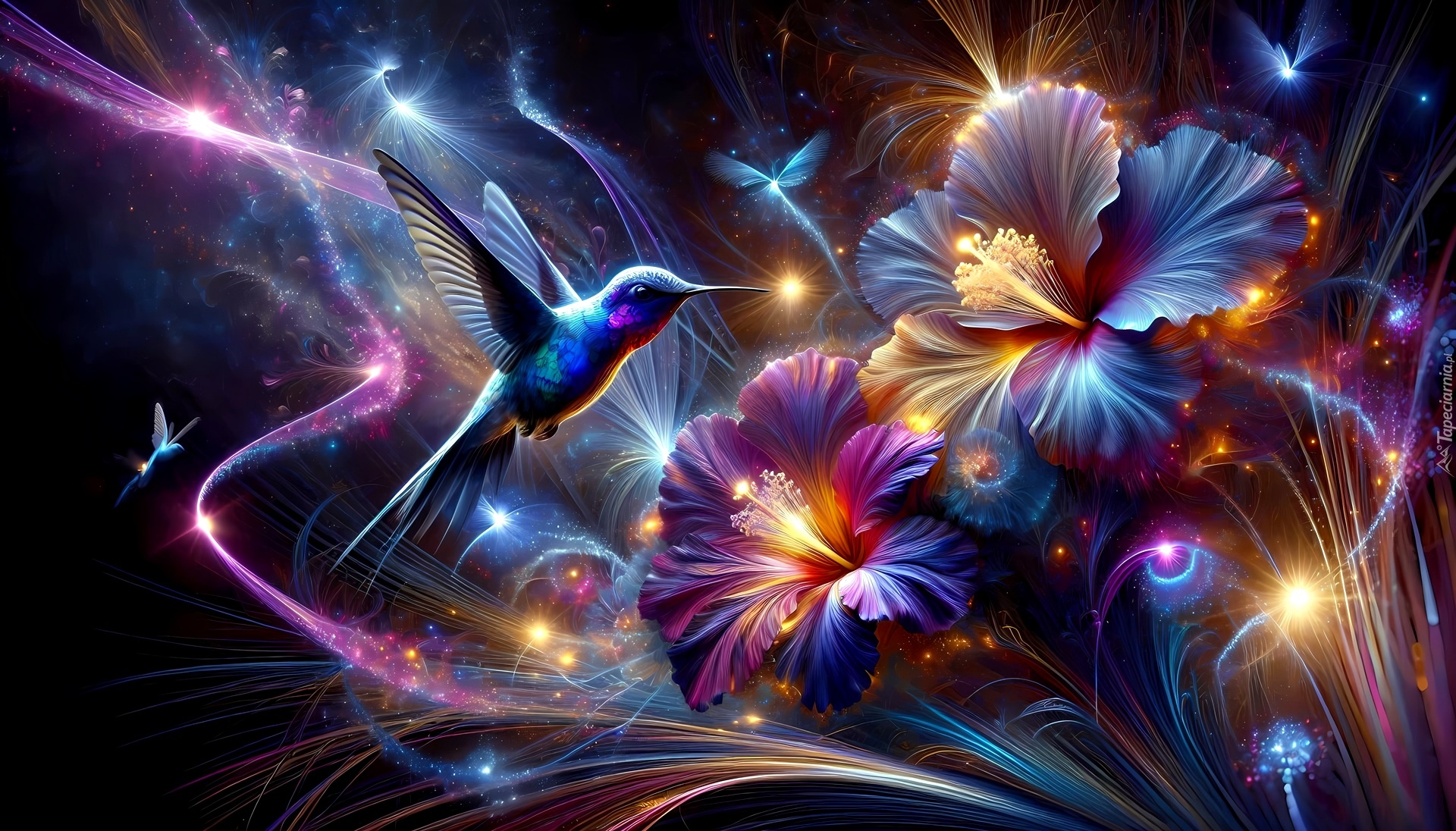 Edytor tapety: Koliber i rozświetlone fioletowe kwiaty w grafice