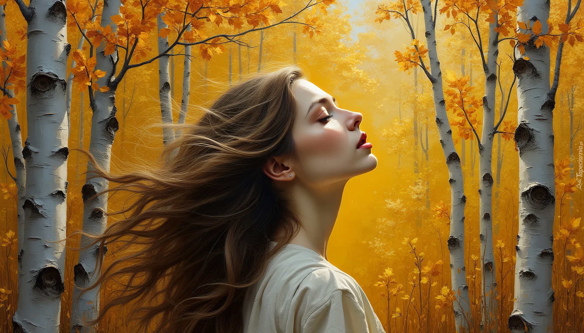 Edytor tapety: Długowłosa kobieta pod jesiennymi brzozami w słonecznym lesie