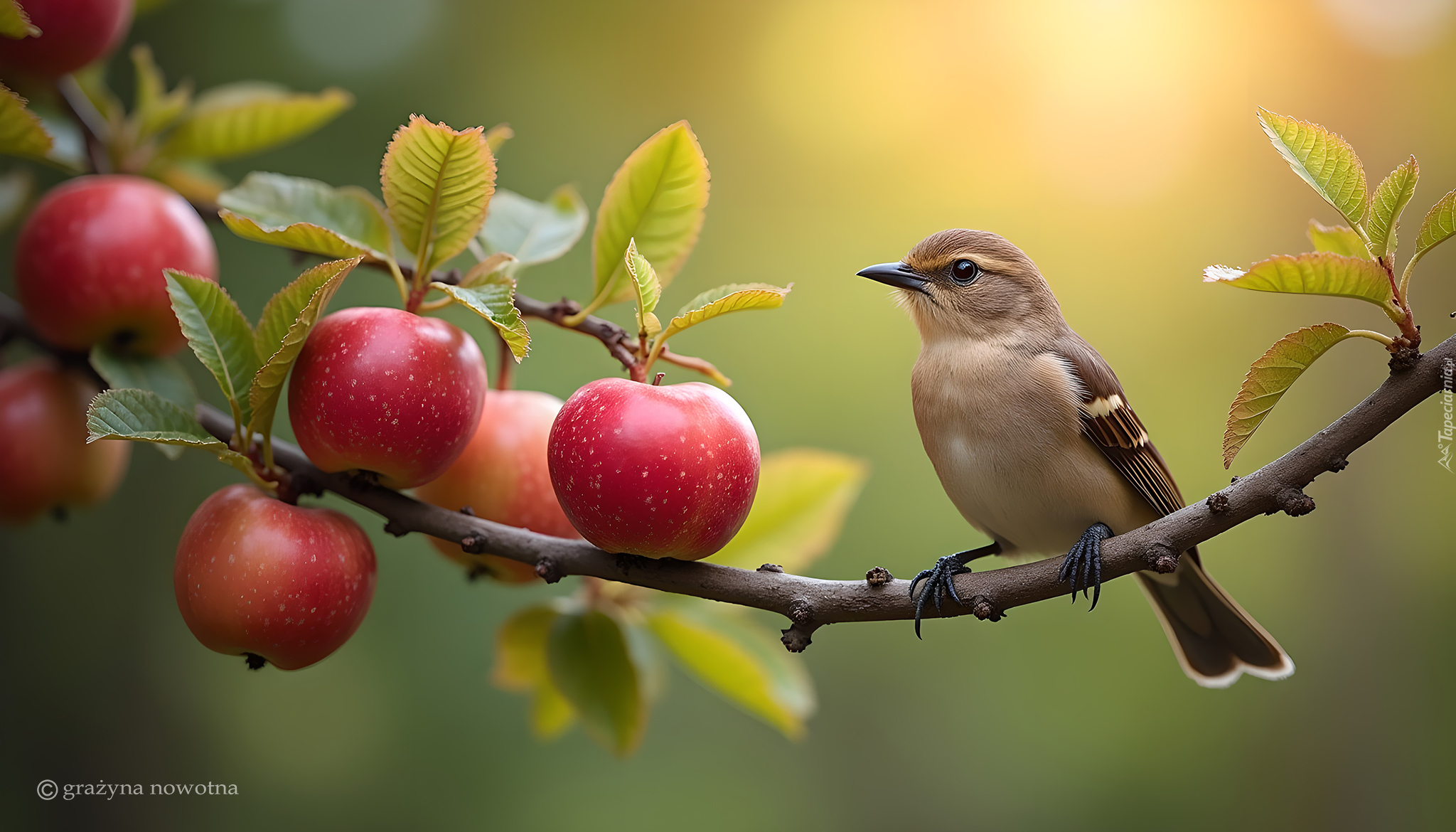 Edytor tapety: Ptak i czerwone jabłka na gałązce w grafice