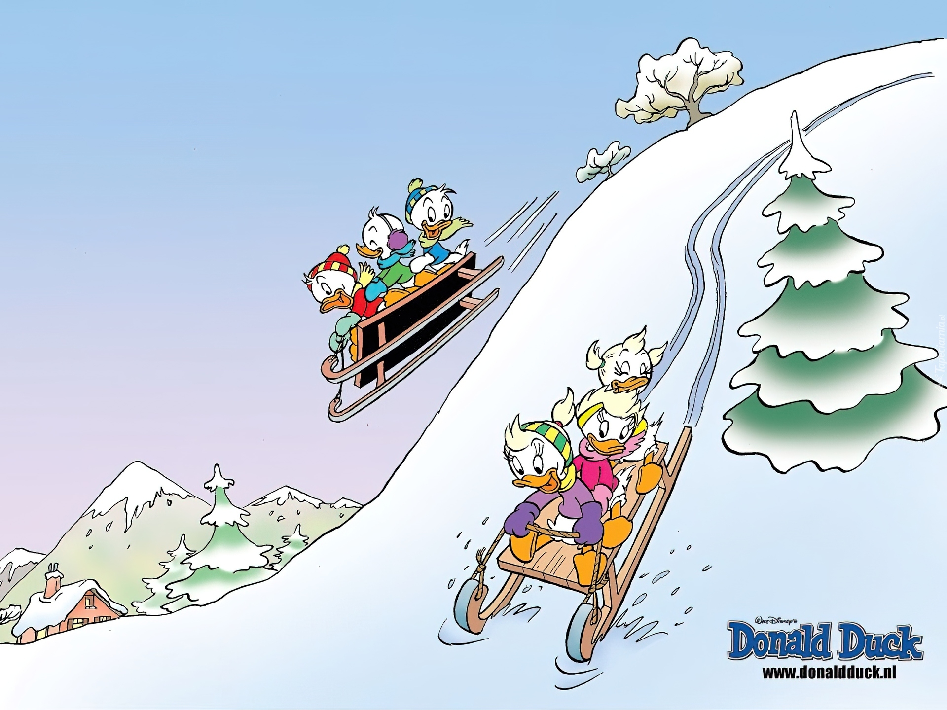 Edytor tapety: Kaczor Donald, sanki, śnieg