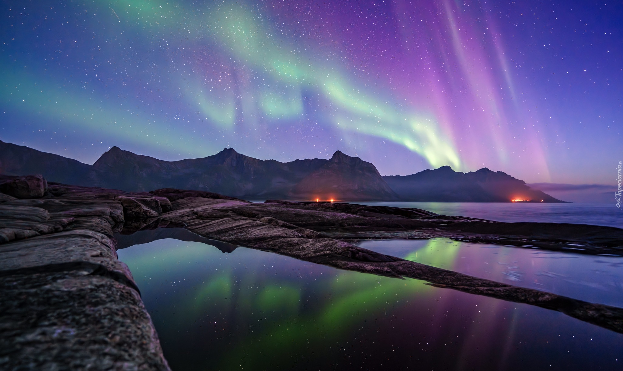 Edytor tapety: Zorza polarna nad norweskimi górami i morzem