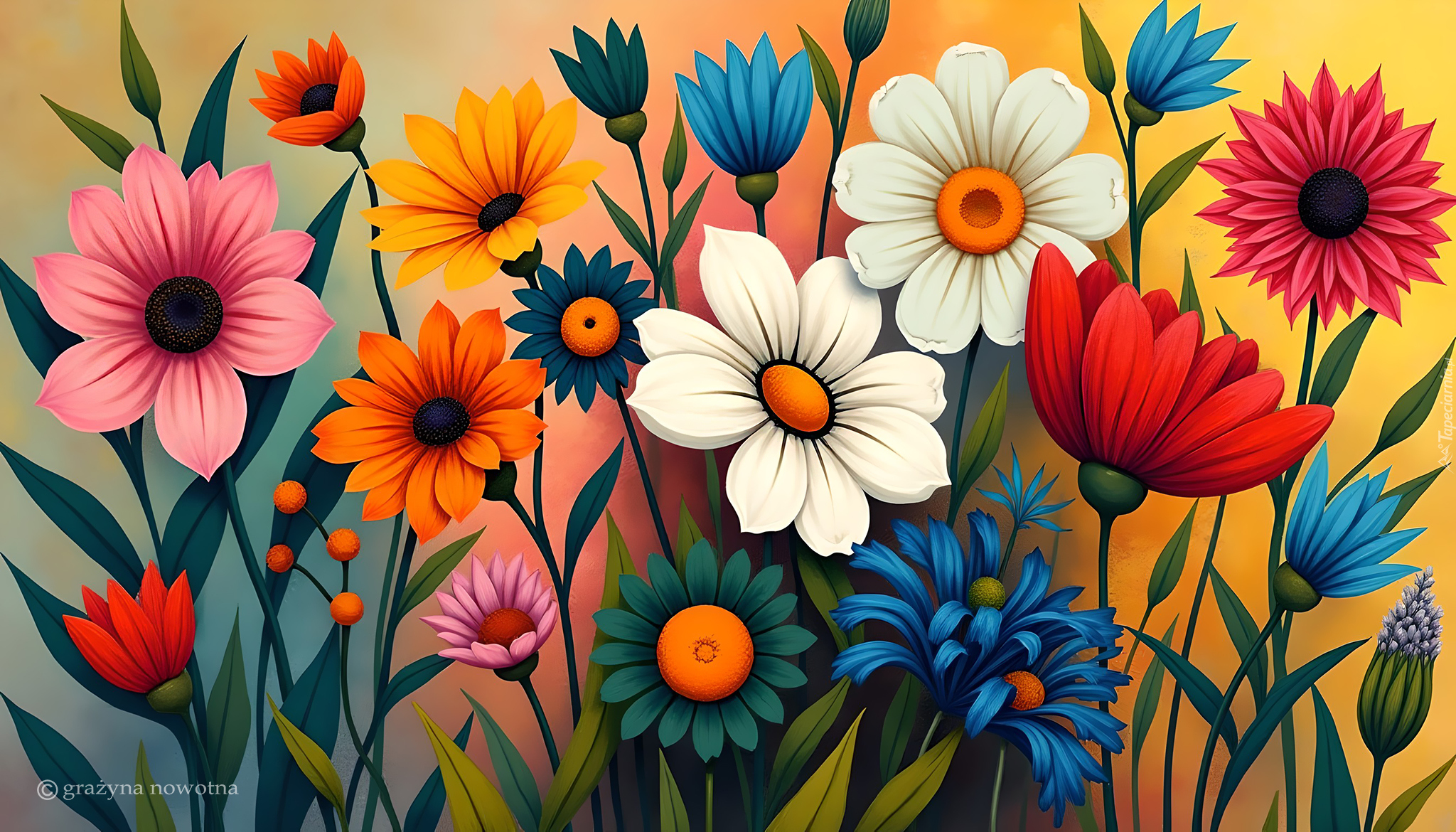 Edytor tapety: Różnorodne kolorowe kwiaty w grafice