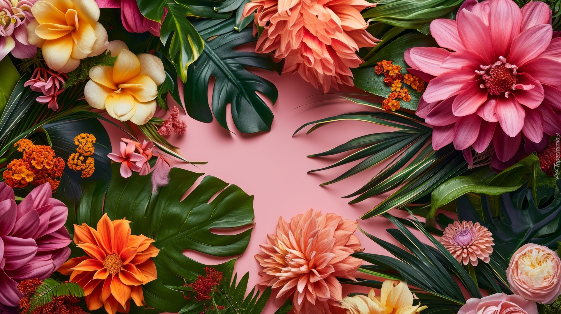 Edytor tapety: Kolorowe kwiaty i liście palmy na różowym tle